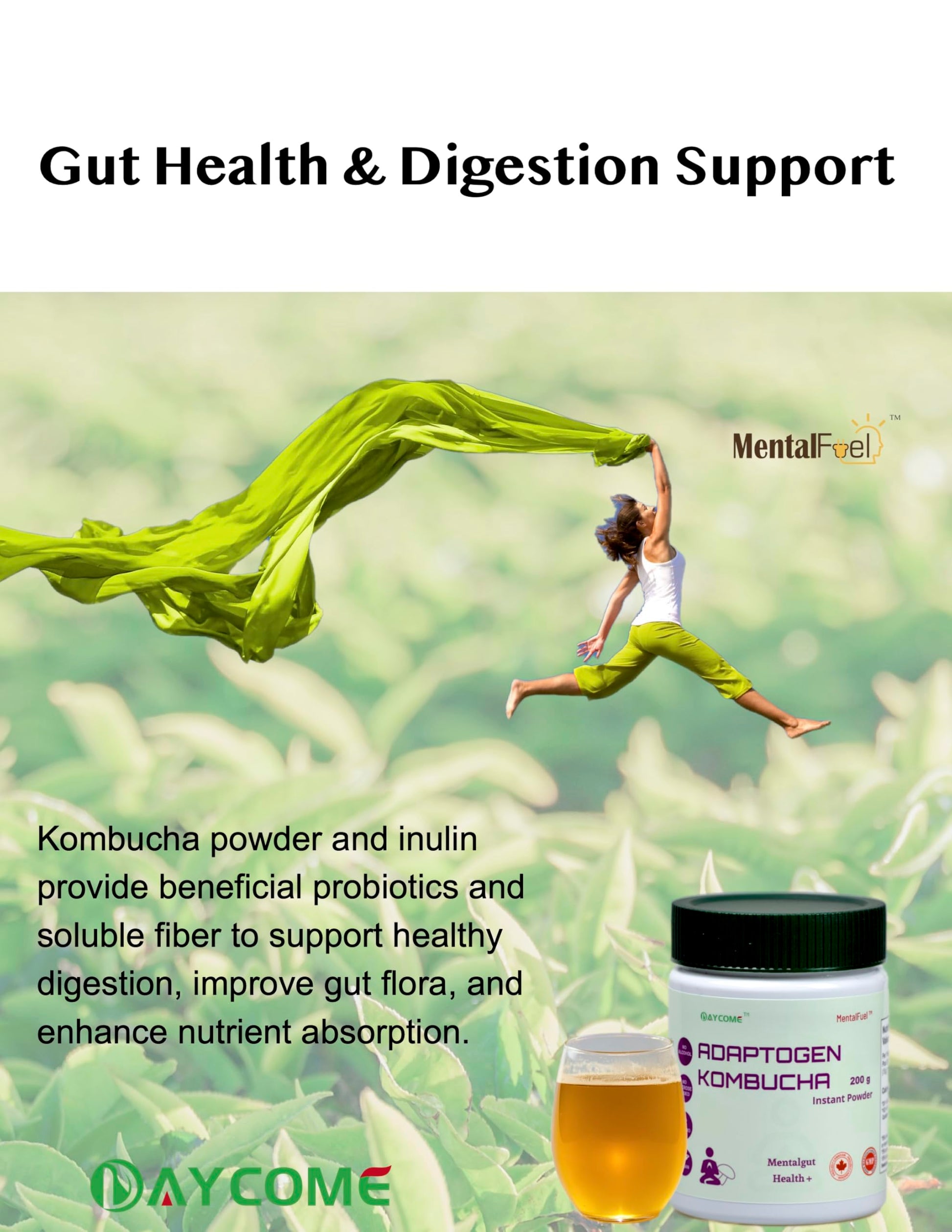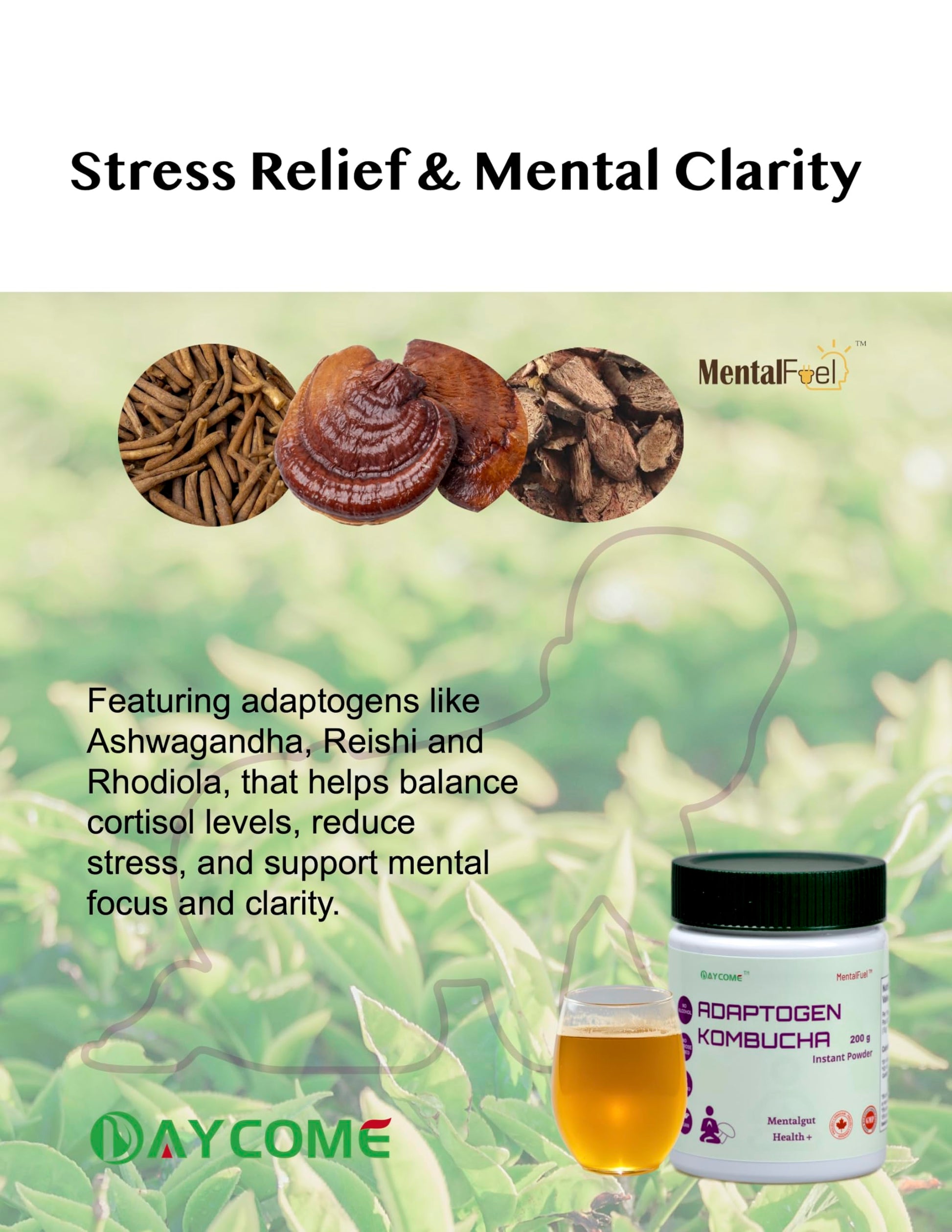 - Q: What are the health benefits of MentalFuel Adaptogen Kombucha Instant Powder? A: MentalFuel Adaptogen Kombucha Instant Powder is packed with adaptogens like Ashwagandha, Rhodiola, and Ginseng, which support energy, focus, and stress relief. Additionally, it contains probiotics and prebiotics that promote gut health and overall well-being.