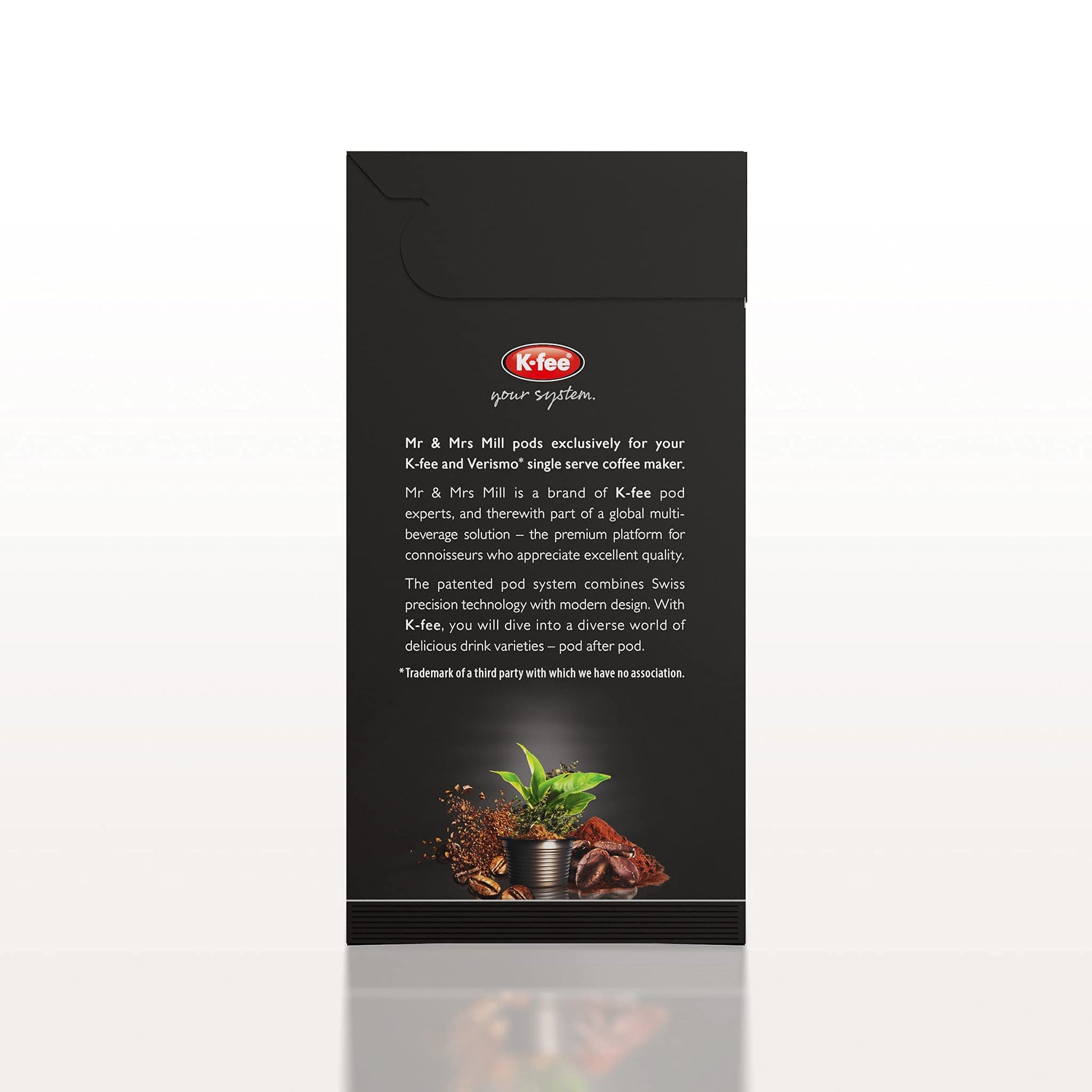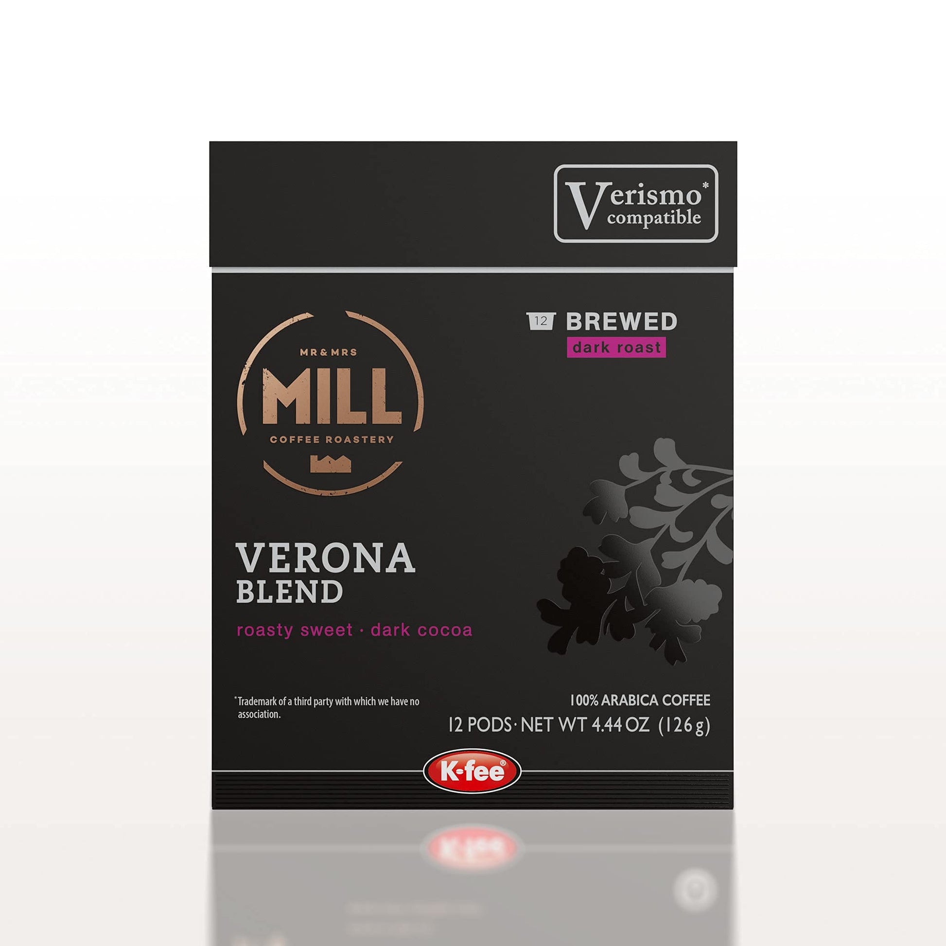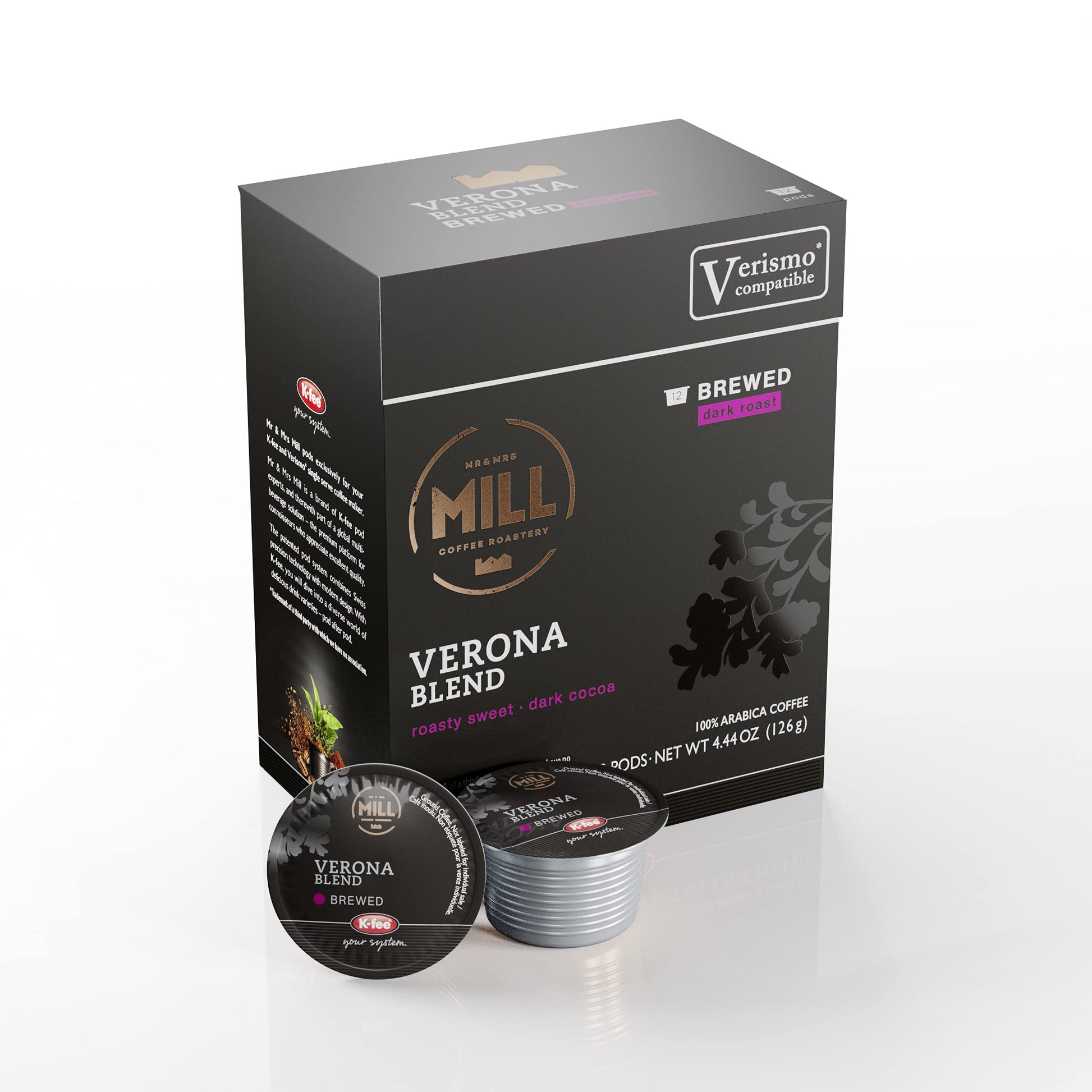 Mr & Mrs Mill Brewed Coffee K-Fee And Starbucks Verismo Compatible Capsules: No One Can Motivate You Better Than Yourself. This Dark And Bold Roast Is Designed To Support You In Pursuing Great Goals. First, You Taste Roasted Notes That Stimulate Your Senses, Then Hints Of Inspiring Spices, Followed By Rewarding Flavors Of Dark Chocolate. For This Blend, We Use Arabica Coffees From Central America, South America, And Papua New Guinea. | Rich Brewed Coffee At Home: Mr & Mrs Mill Verona Blend Is Perfect For Making A Dark Roasted, Flavorful Brewed Coffee At Home. Each Verismo* Compatible K-Fee Coffee And Espresso Maker Has Its Own Programmable Button That Allows You To Set The Amount Of Water Dispensed. | K-Fee Smart Brew: The Big Cup Of Coffee. Without Crema, As You Are Used To From Typical Brewed Coffee. In K-Fee Pods, Thanks To Their Innovative Design, This Process Is Replicated By The Remarkable Pod Shape And Unique Technology. Simple Pick Up The Capsule, Pull The Tab, And Brew An Rich, Smooth Cafe Quality Coffee Right At Home. | Craftsmanship For All Five Senses: The Heat In The Drum Roaster Is Gently Increased. After About 10 Minutes, You