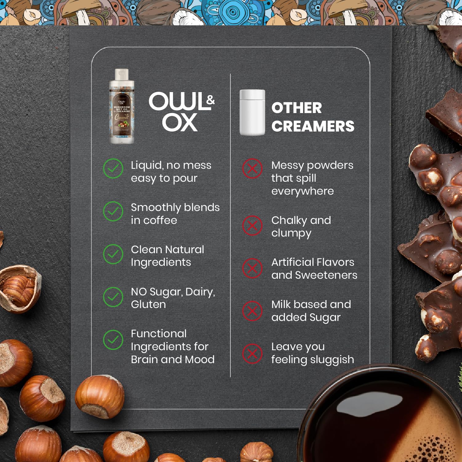 - Q: How do I use the Mushroom Coffee Creamer in my beverages? A: The Mushroom Coffee Creamer comes in a convenient squeeze bottle, making it easy to add to coffee, tea, smoothies, or any beverage of your choice. Simply squeeze the desired amount into your drink and enjoy a rich hazelnut chocolate flavor.