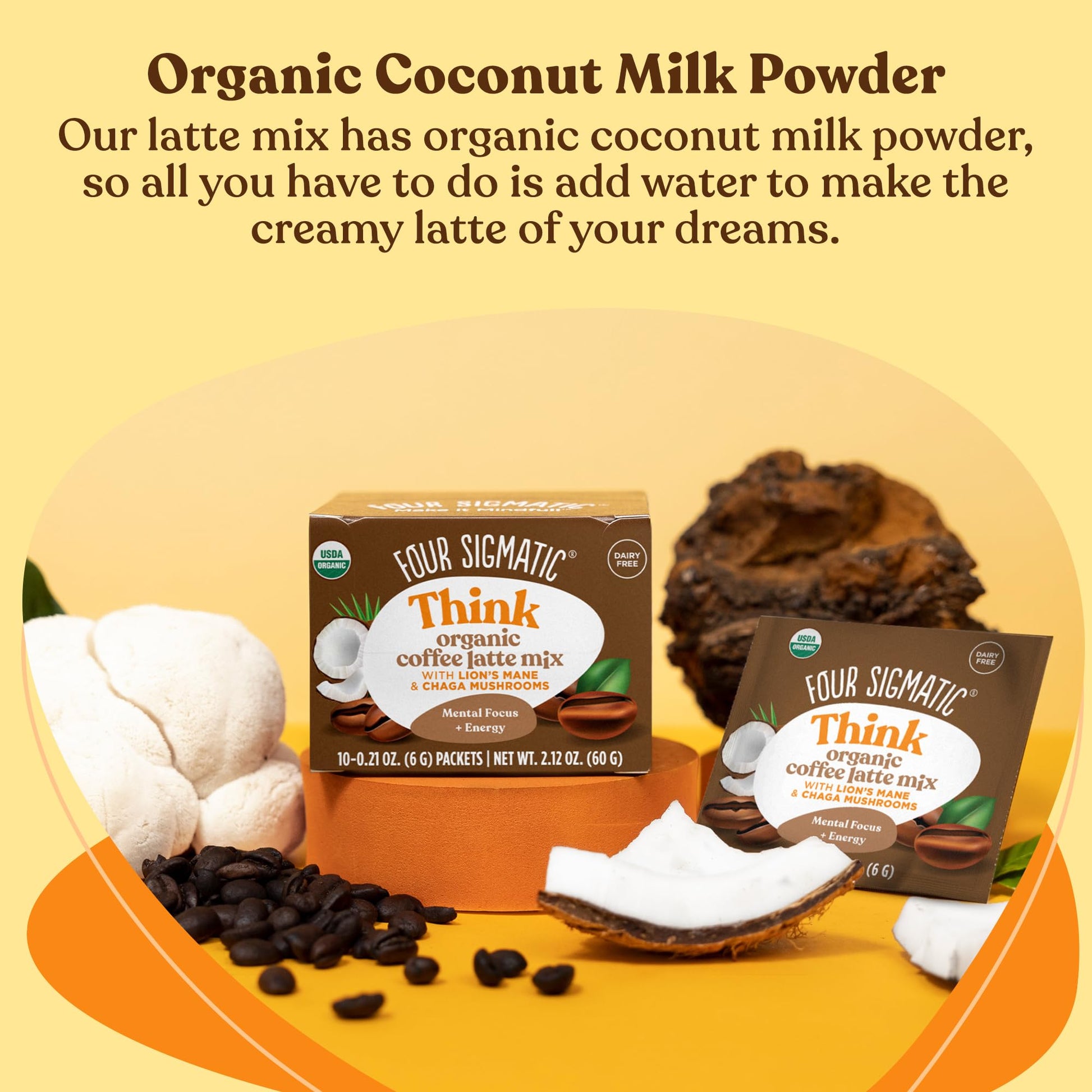 Q: What are the main ingredients in the Mushroom Coffee Latte by Four Sigmatic?A: The Mushroom Coffee Latte by Four Sigmatic contains organic Lion's Mane mushroom powder, organic chaga mushroom powder, coconut milk powder, and superfood powders such as mucuna and lucuma.