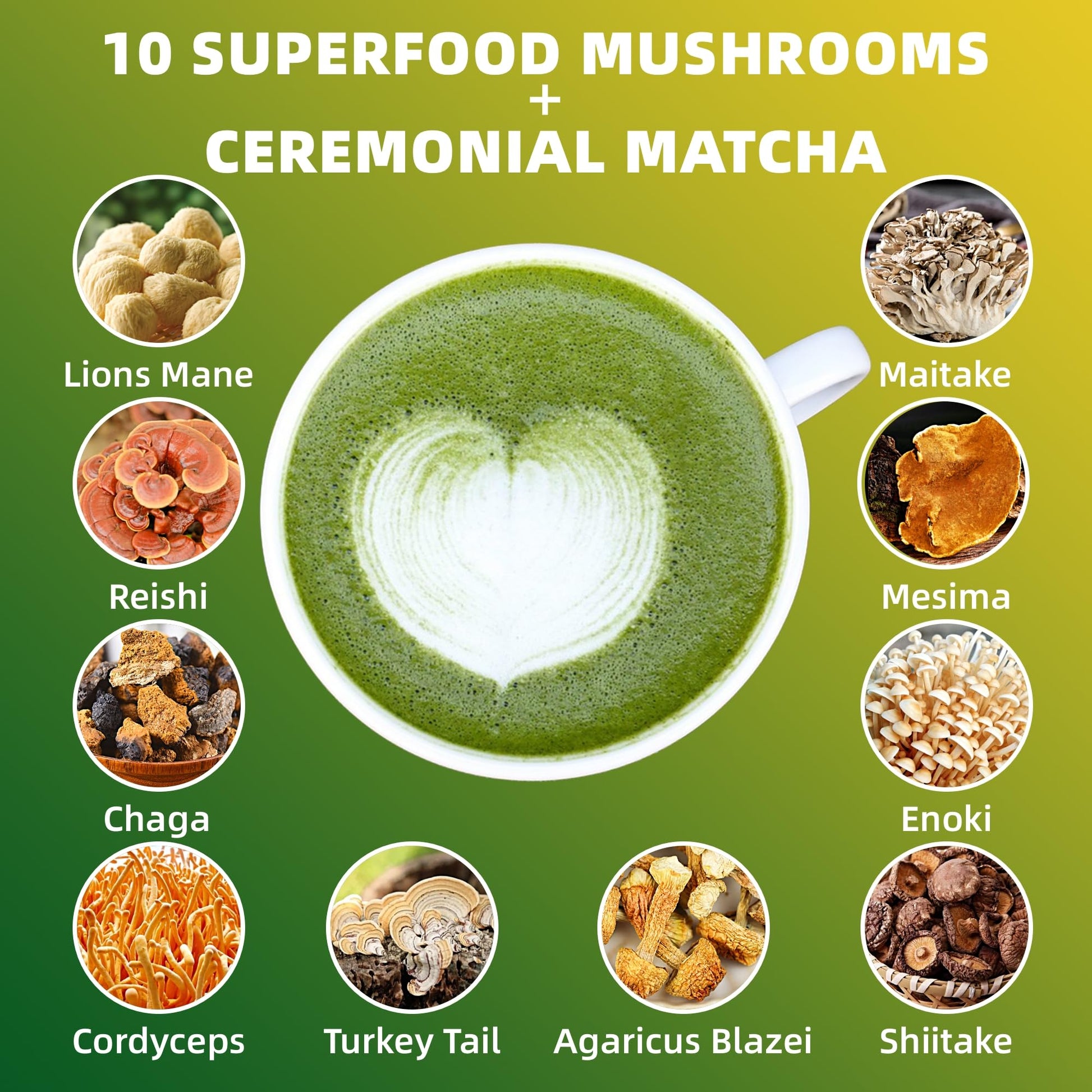 - Q: What are the health benefits of Mushroom Matcha? A: Mushroom Matcha combines ceremonial grade matcha with 10 powerful mushrooms, offering a range of health benefits including immune support, enhanced focus, increased energy, and cognitive function. Key mushrooms like Lion's Mane and Reishi are known for their antioxidant properties, while Cordyceps promotes endurance and anti-aging.