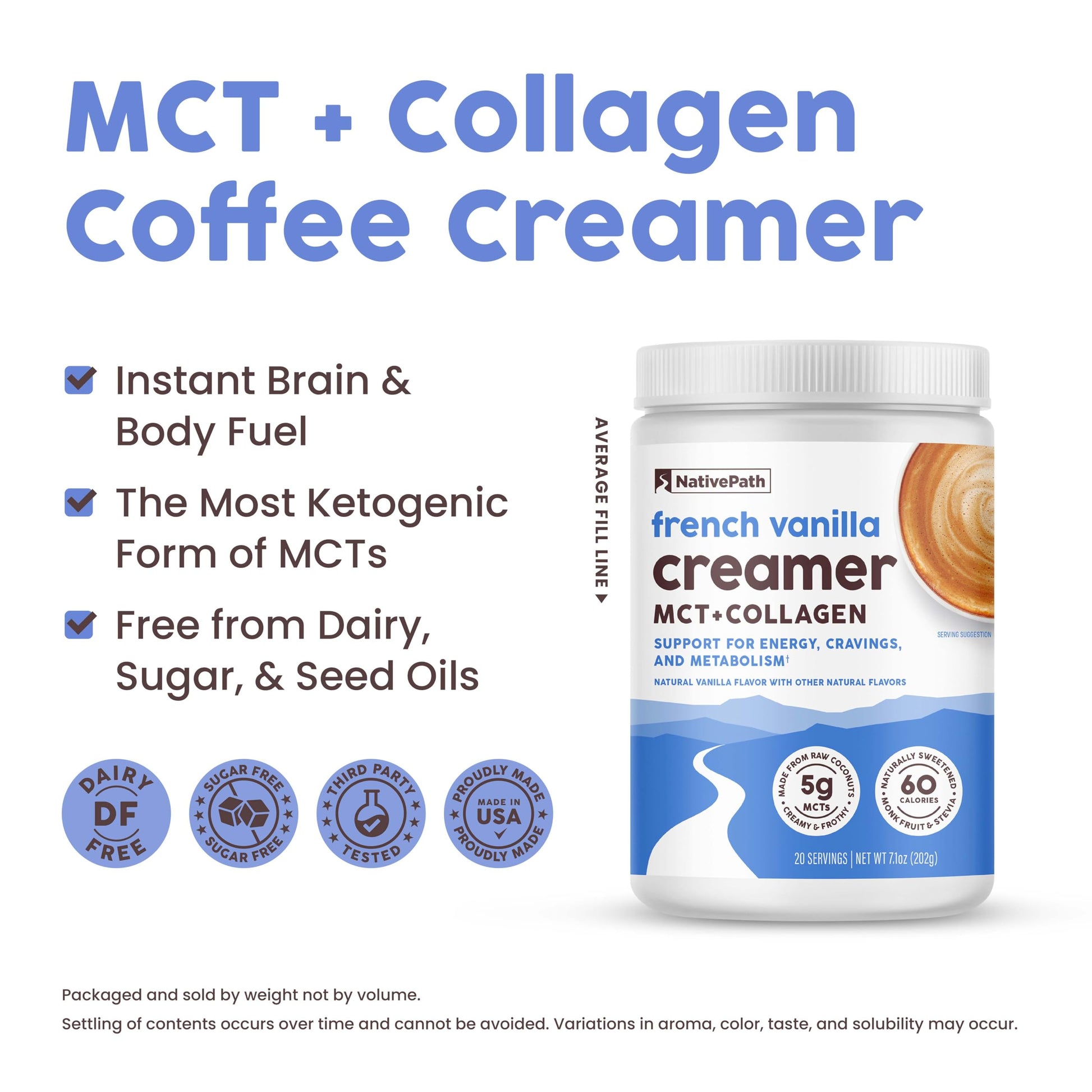 - Q: What are the main ingredients in NativePath Keto Coffee Creamer? A: NativePath Keto Coffee Creamer is made with high-quality ingredients including Grass-Fed Collagen Peptides, MCT Oil derived from raw coconuts, and natural sweeteners like Monk Fruit and Stevia. This blend not only enhances the flavor of your coffee but also supports your health.