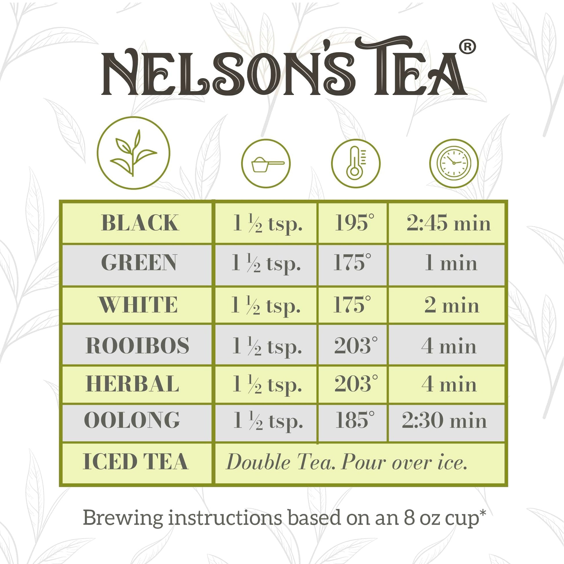 Q: How should I brew Nelson's Orange Chocolate Tea for the best flavor?A: For optimal flavor, steep 1 teaspoon of the loose leaf Orange Chocolate Tea in hot water (around 200°F) for 5-7 minutes. Adjust the steeping time to taste.