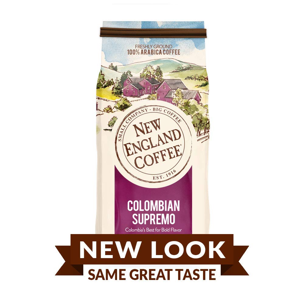 - Q: What is the size of the New England Coffee Colombian Supremo bag? A: The New England Coffee Colombian Supremo comes in an 11-ounce bag, which makes it convenient for home use or for sharing with family and guests.