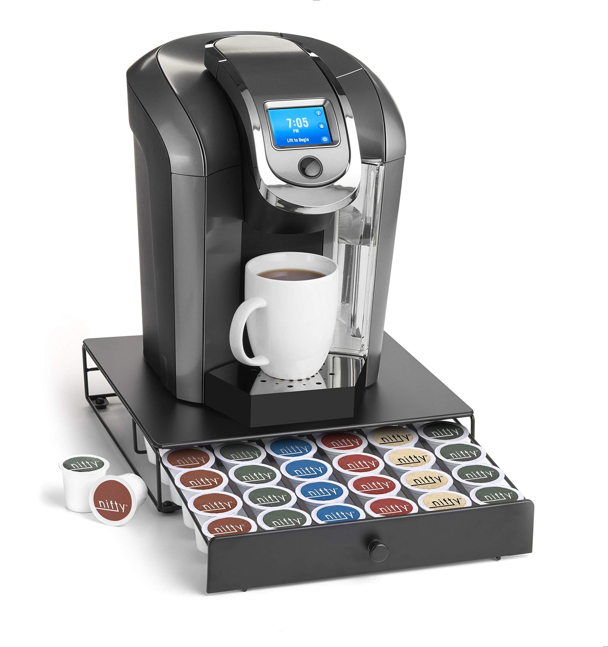 Q: How many K-Cup pods can the NIFTY Storage Drawer hold?A: The NIFTY Storage Drawer can hold up to 36 K-Cup pods, making it a great option for coffee lovers who want to keep their favorite flavors organized and easily accessible.