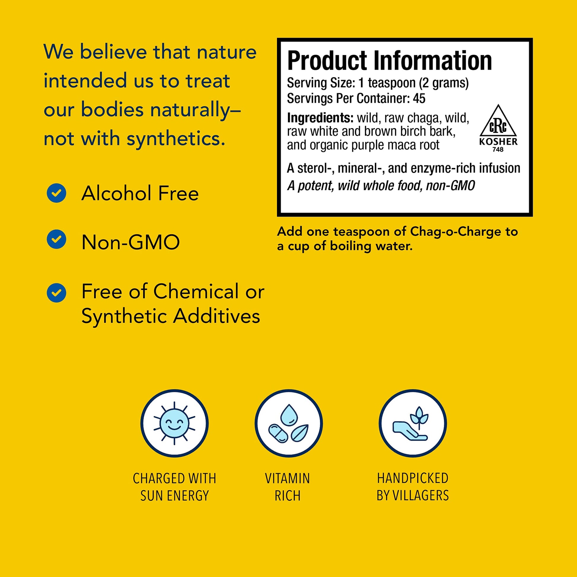 - Q: What makes Chag-o-Charge different from other herbal teas? A: Chag-o-Charge stands out due to its unique blend of wild raw chaga mushroom and organic purple maca root, both sourced from pristine regions. Its high levels of antioxidants and nutrients combined with a commitment to non-GMO, chemical-free ingredients make it a premium choice.