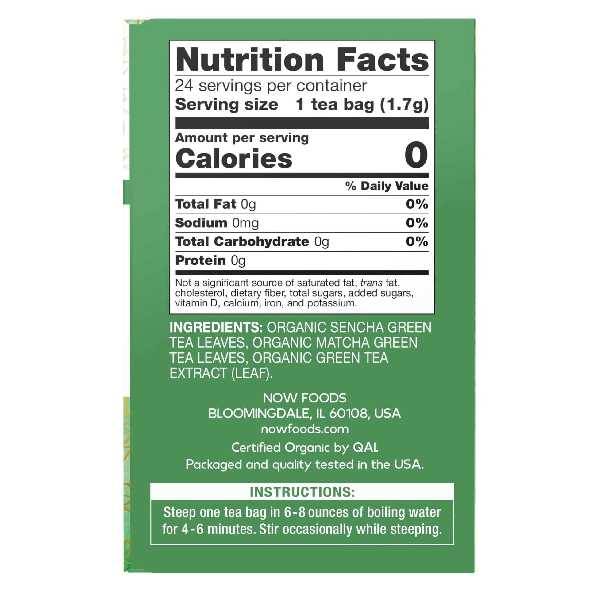 Now Foods, Certified Organic Green Kick Tea, With Polyphenols, Premium Unbleached Tea Bags With No-Staples Design, No Added Colors, Preservatives, Flavors, Or Sugars, 24-Count