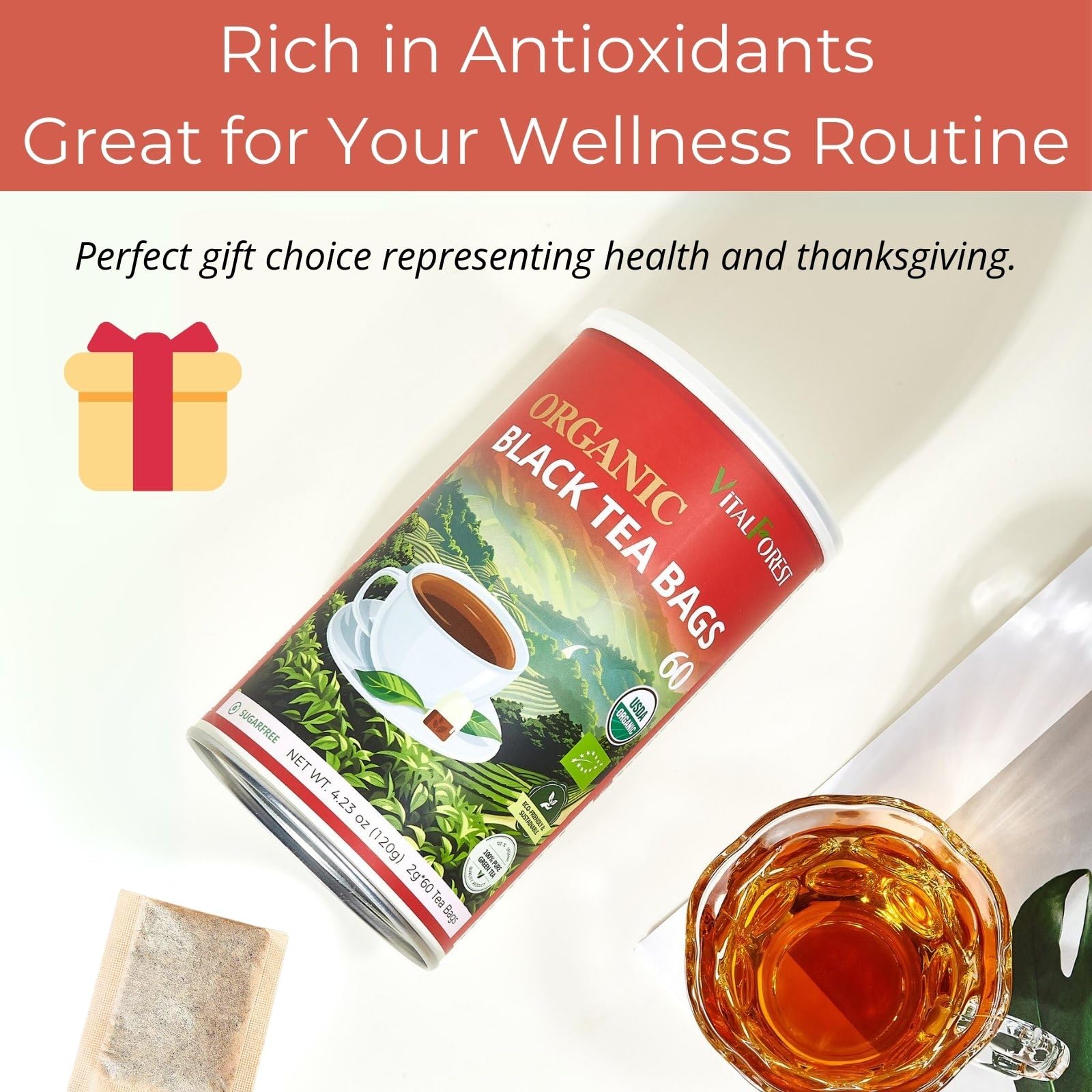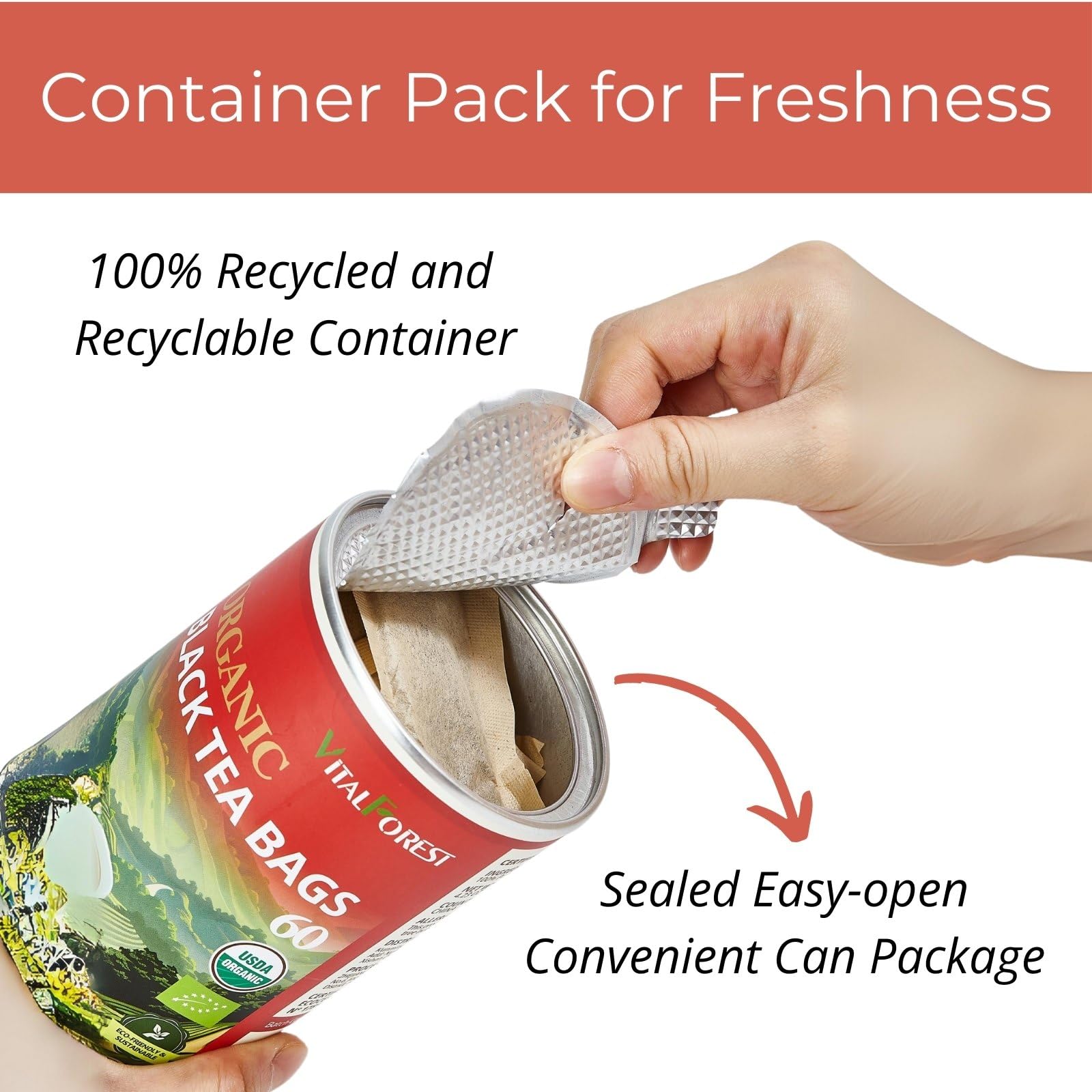 Organic Black Tea Bags| 60 Count Vitalforest Unbleached Eco-Conscious English Breakfast Black Tea Bags| Te Negro Organico Natural| Premium Caffeinated Black Tea Loose Leaf| Canister Pack For Freshness