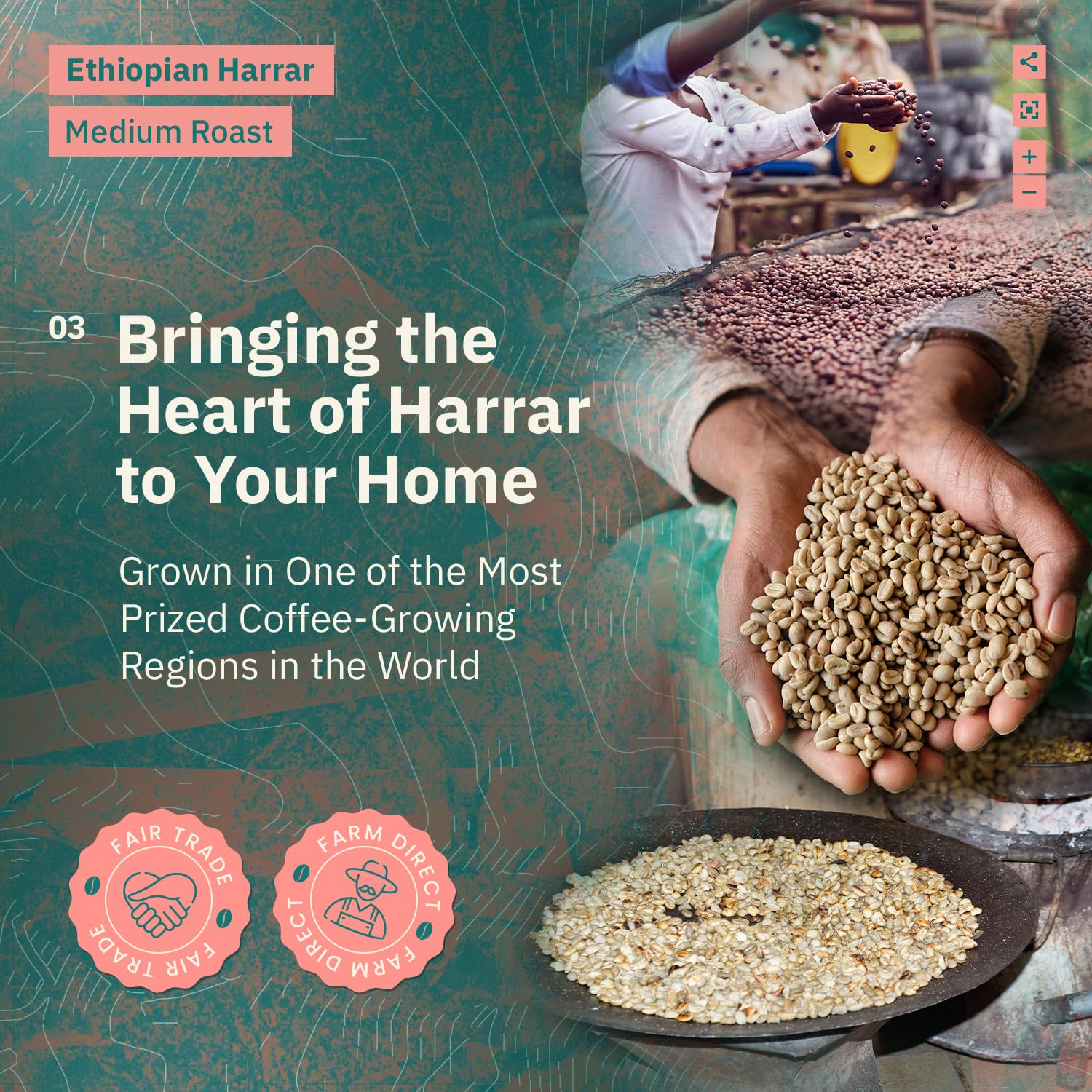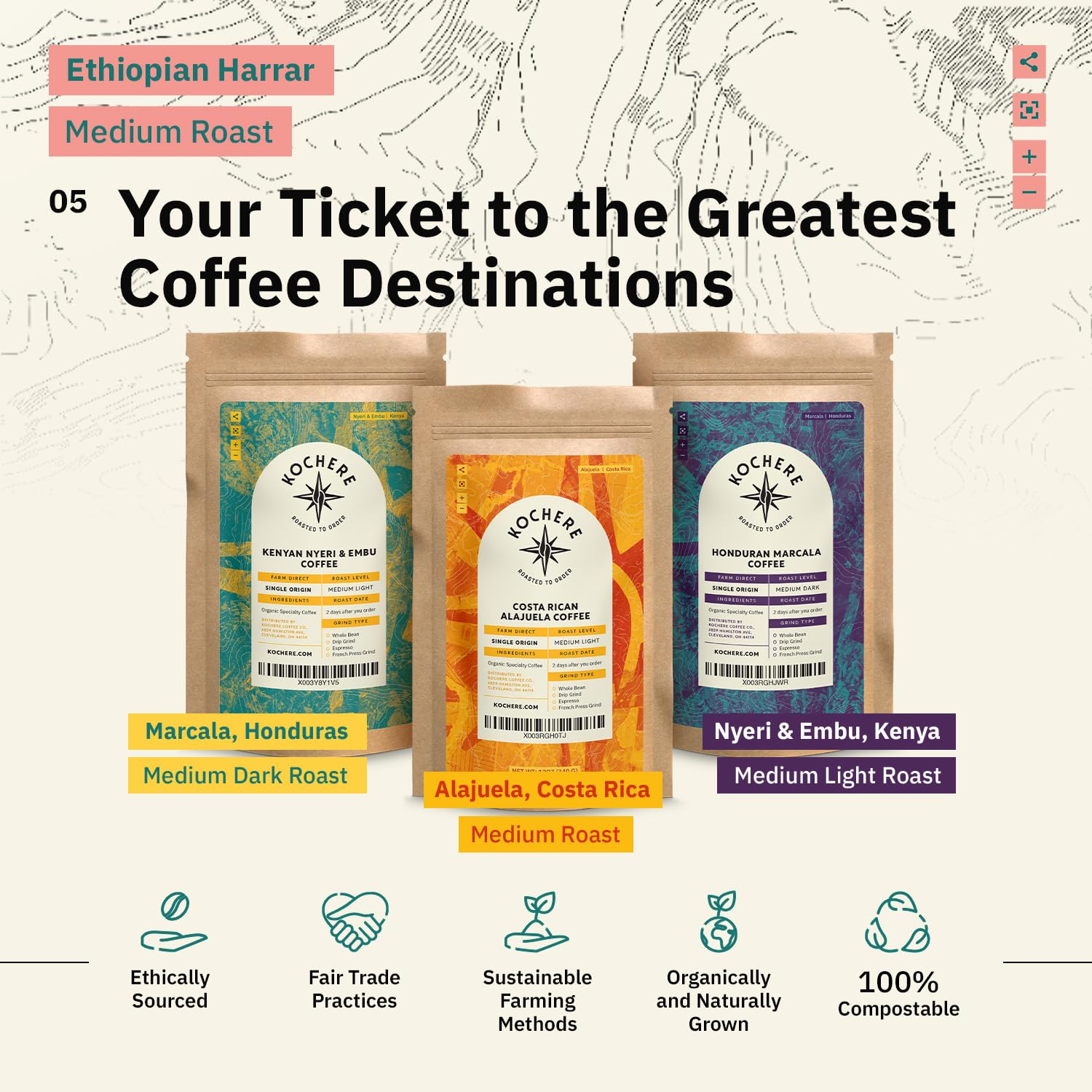 - Q: What makes Kochere Ethiopian Whole Bean Coffee unique? A: Kochere Ethiopian Whole Bean Coffee is unique due to its single-origin sourcing from the Harrar region, which is known for its nutrient-rich vertosol soils. This environment contributes to the coffee's complex flavor profile, featuring deep and fruity notes of chocolate, caramel, and a hint of jasmine.