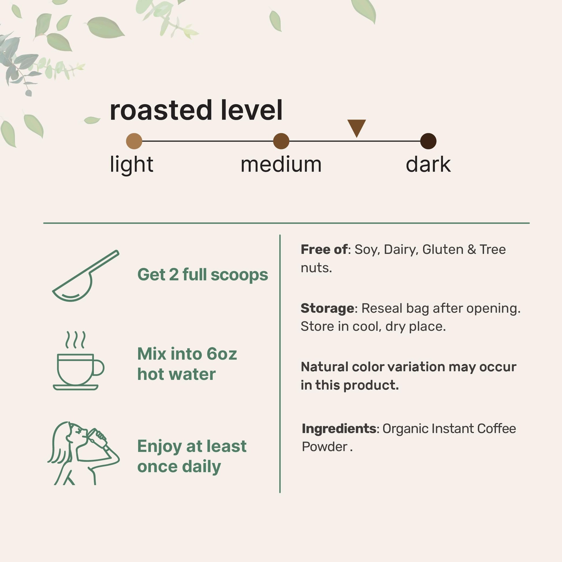 - Q: Is this instant coffee suitable for people with dietary restrictions? A: Yes, this Organic Instant Coffee is suitable for individuals with various dietary restrictions as it is non-GMO, gluten-free, and made without soy, dairy, or tree nuts. It's a great option for those looking for a clean and pure coffee product.