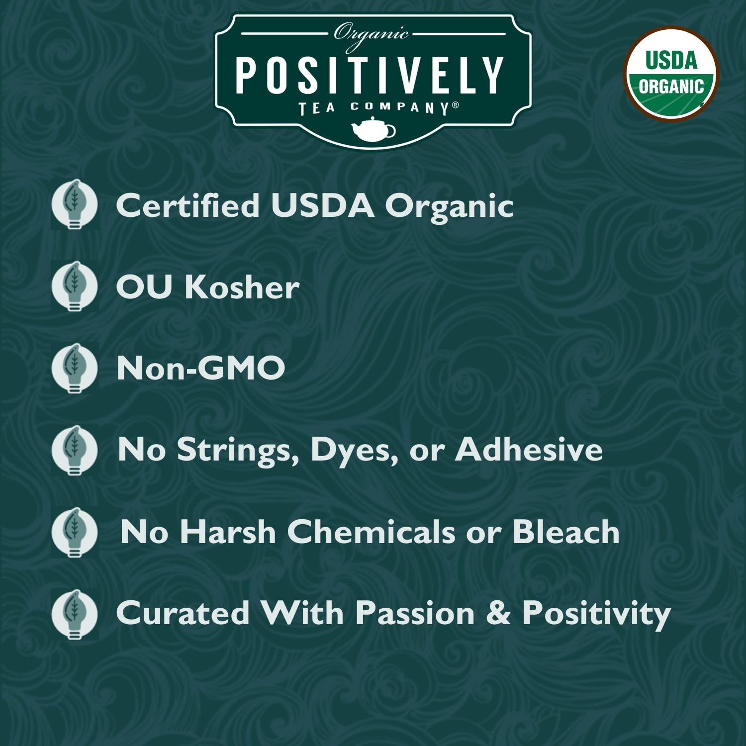 Here At Positively Tea, Were Curating The Worlds Most Positive Tea Experience. We Believe That High-Quality Tea Products Promote Overall Health And Well-Being. Tea Is Meant To Be Enjoyed, And The Process, Brewing Either Loose-Leaf Or Bagged Tea, Should Be As Health-Conscious As Possible. Were Proud To Offer Exclusively Bleach And Glue-Free Tea Bags So That Every Positively Tea Customer Can Enjoy The Natural Flavors And Benefits Without The Use Of Toxic Glues And Chemicals. Our Entire Product Line Is Usda Certified Organic And Sourced With The Utmost Care So You Always Arrive At An Outstanding Cup Of Tea.