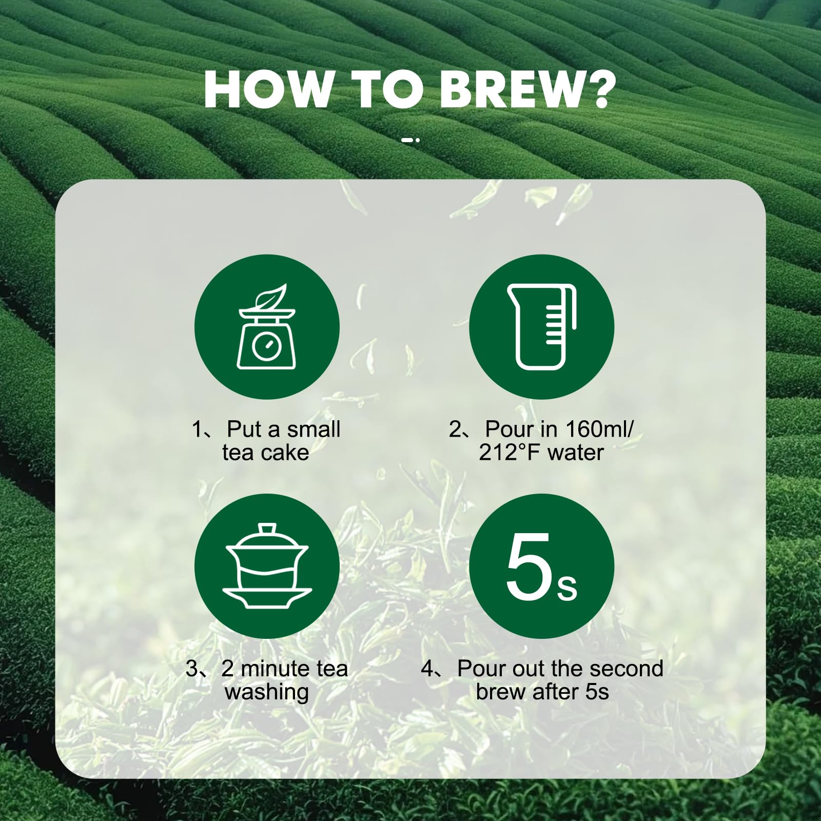 - Q: How do I brew Organic Pu Erh Tea Cake for the best flavor? A: To brew Organic Pu Erh Tea Cake, place a small cake into your cup and add 160ml of water at 212°F. Steep for 2 minutes initially to wash the tea, then for subsequent brews, steep for just 5 seconds to enjoy the rich aroma and flavor.