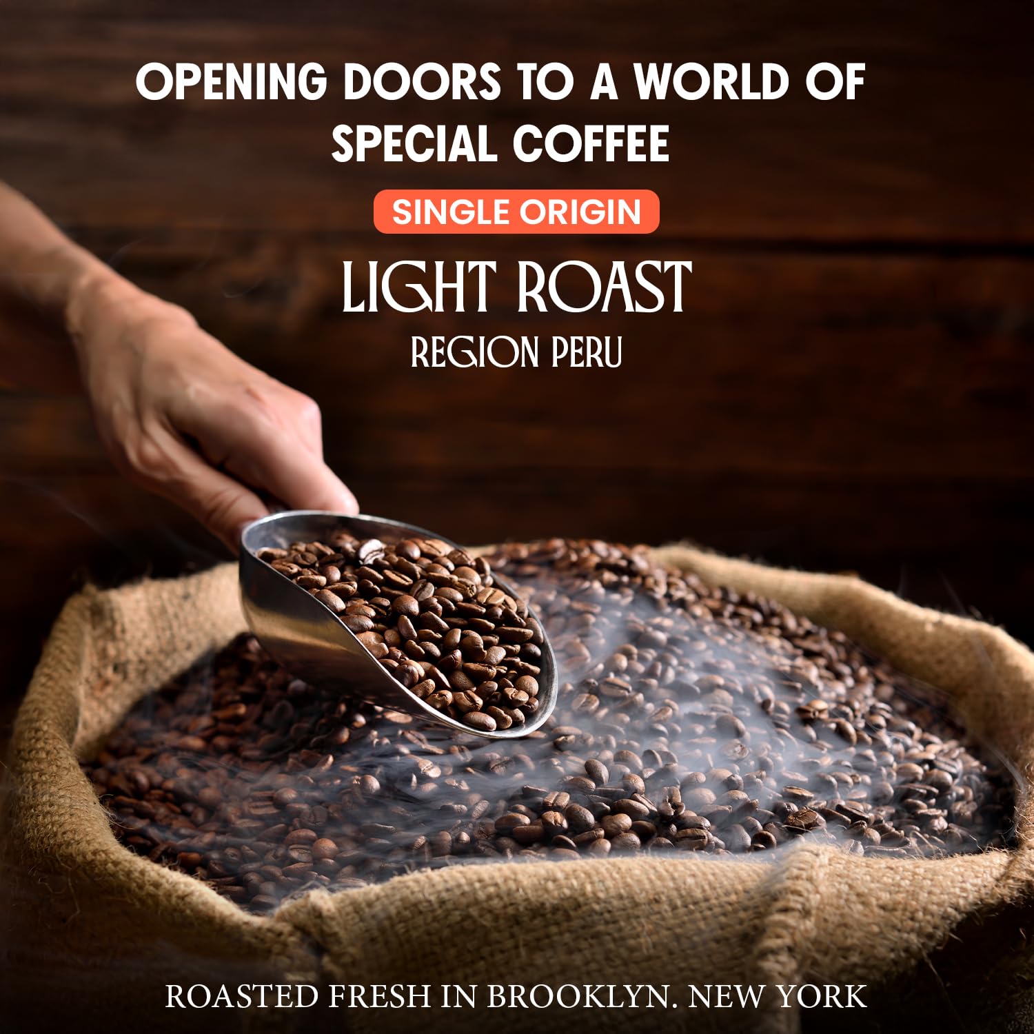 Q: What flavor notes can I expect from Peru Highlands Whole Coffee Beans?A: Peru Highlands Whole Coffee Beans offer a vibrant mix of bright citrus, pear, and a honey floral finish, delivering a unique and refreshing taste with every cup.