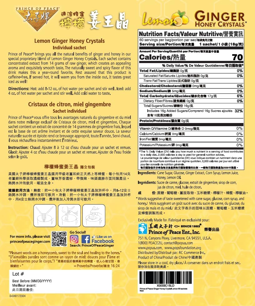 Q: How do I prepare Prince of Peace Instant Ginger Honey Crystals?A: To prepare the Instant Ginger Honey Crystals, simply add 8 oz. to 12 oz. of hot or cold water per sachet. Stir well and adjust the water level to suit your taste preferences.