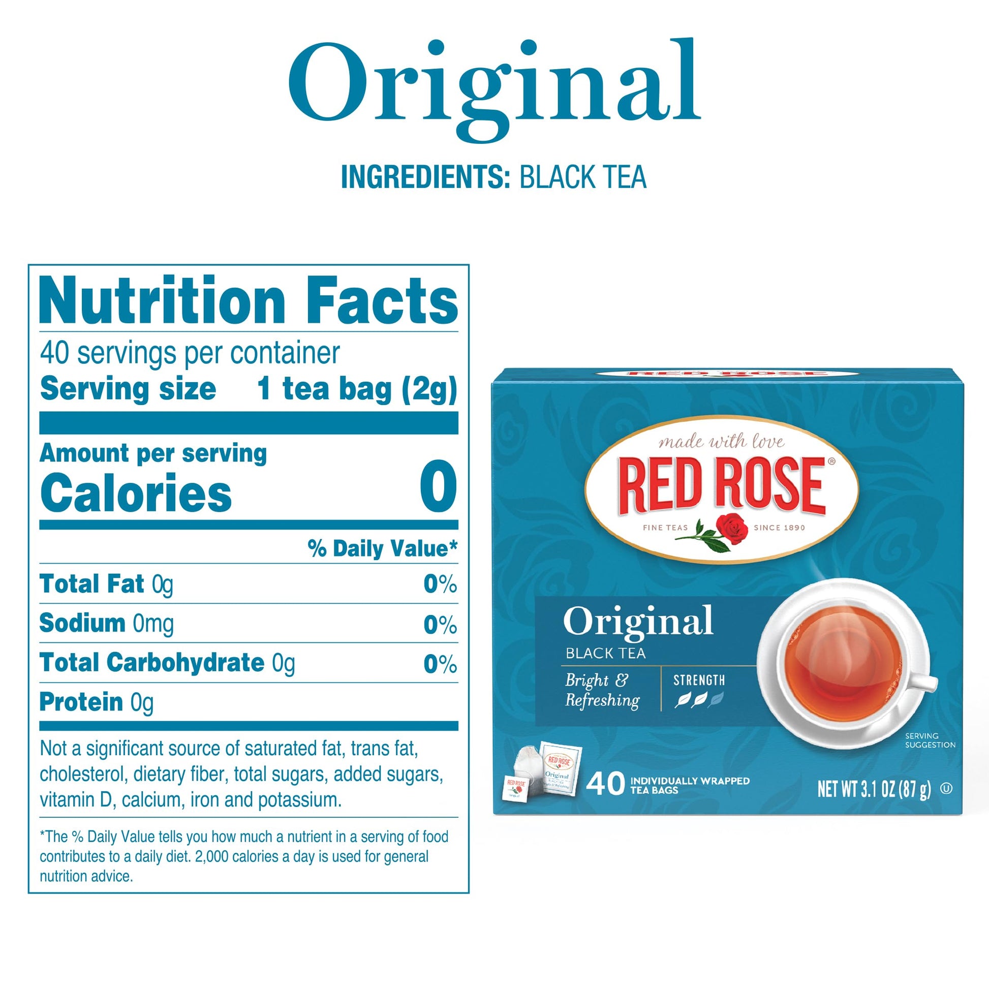 Q: How many tea bags are included in each box of Red Rose Original Black Tea?A: Each box of Red Rose Original Black Tea contains 40 tea bags, making it convenient for both single servings and sharing with family and friends.