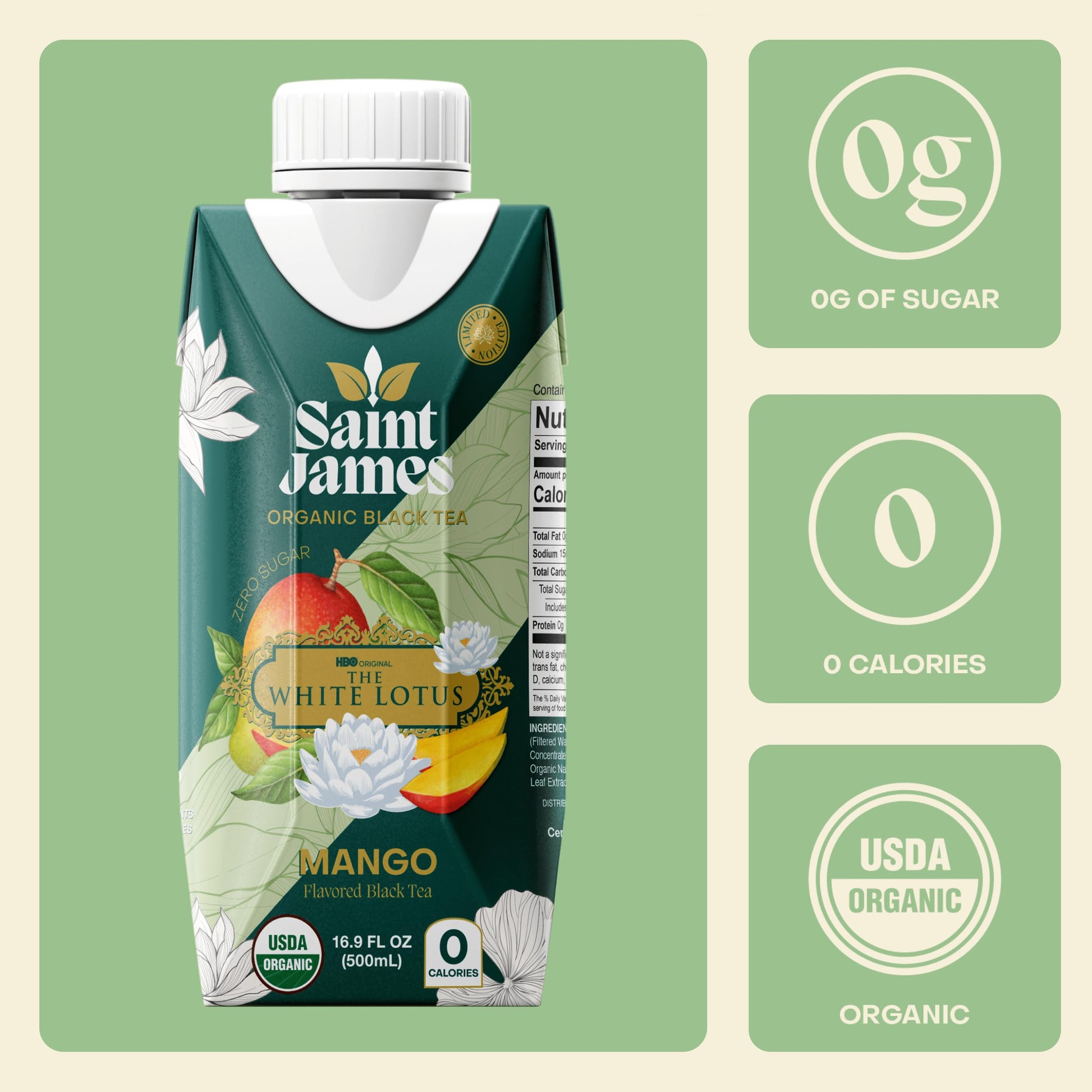 - Q: What makes Saint James Iced Tea unique compared to other iced teas? A: Saint James Iced Tea stands out due to its unique collaboration with HBO’s The White Lotus, featuring a limited edition Mango flavor. It is made with all organic ingredients, contains no artificial additives, and offers 0 calories and 0 sugar, making it a healthier choice among ready-to-drink teas.