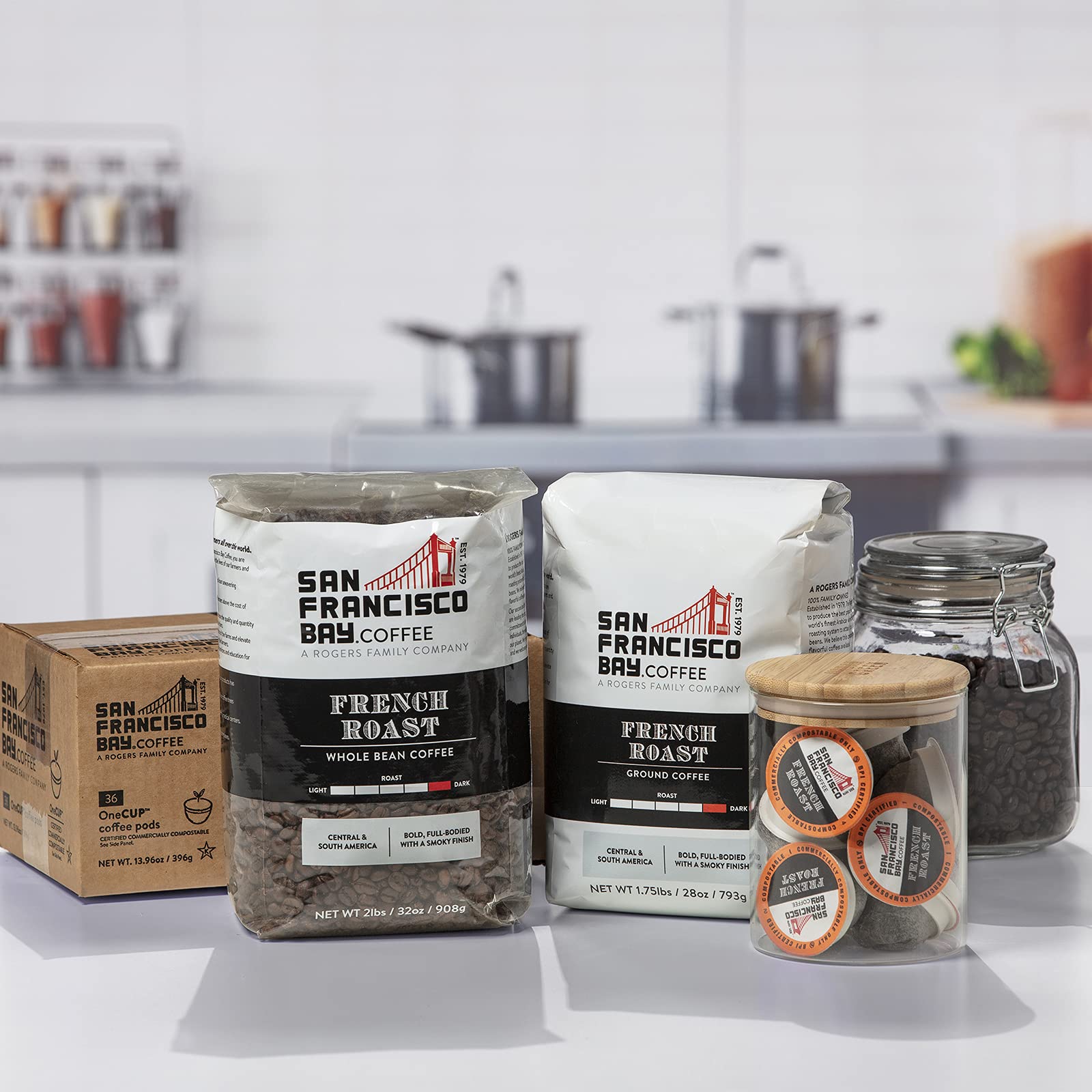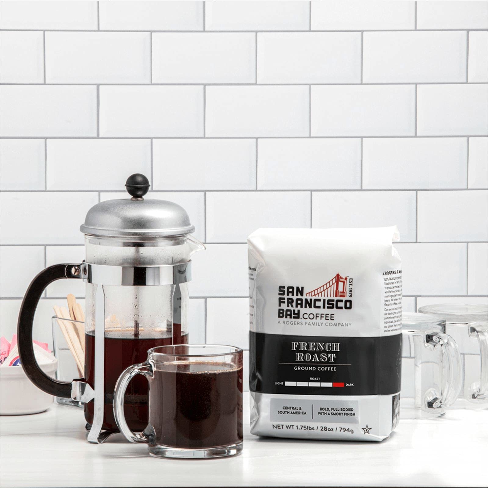 Q: What type of coffee beans are used in San Francisco Bay Ground Coffee - French Roast?A: San Francisco Bay Ground Coffee - French Roast is made from 100% arabica coffee beans sourced from Central and South America, ensuring a rich and smooth flavor profile.