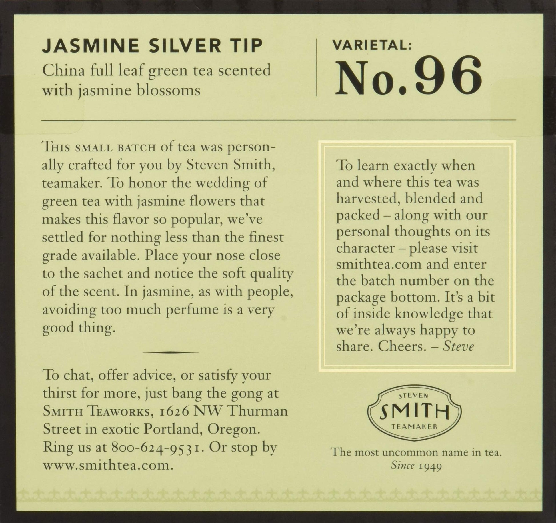 Varietal No. 96. China Full Leaf Green Tea Scented With Jasmine Blossoms. Delicate, Tender Leaves From China'S Fujian Province Are Harvested Each May And Steam-Fired To Maintain Their Flavor - Then Placed Amid Just-Picked Jasmine Buds, Which Open Slowly To Share Their Fragrance. Many Call It The Perfect Marriage. This Small Batch Of Tea Was Personally Crafted For You By Steven Smith, Tea Maker. To Honor The Wedding Of Green Tea With Jasmine Flowers That Makes This Flavor So Popular, We'Ve Settled For Nothing Less Than The Finest Grade Available. Place Your Nose Close To The Sachet And Notice The Soft Quality Of The Scent. In Jasmine, As With People, Avoiding Too Much Perfume Is A Very Good Thing. Inside The Smith Sachet. The Shape Is Not Unusual, But The Artistry Inside Is Unique. Our Roomy, Relaxed Fit Sachet Encourages Greater Expansion To Give You Better Flavor. It'S Also Biodegradable. After Steeping, You Can Sashay Straight To The Compost Heap. Steven Smith Tea Maker - The Most Uncommon Name In Tea. Since 1949. 15 Sachets. Net Wt. 1.3 Oz. (37G). Blended And Packed By Smith Tea Maker.