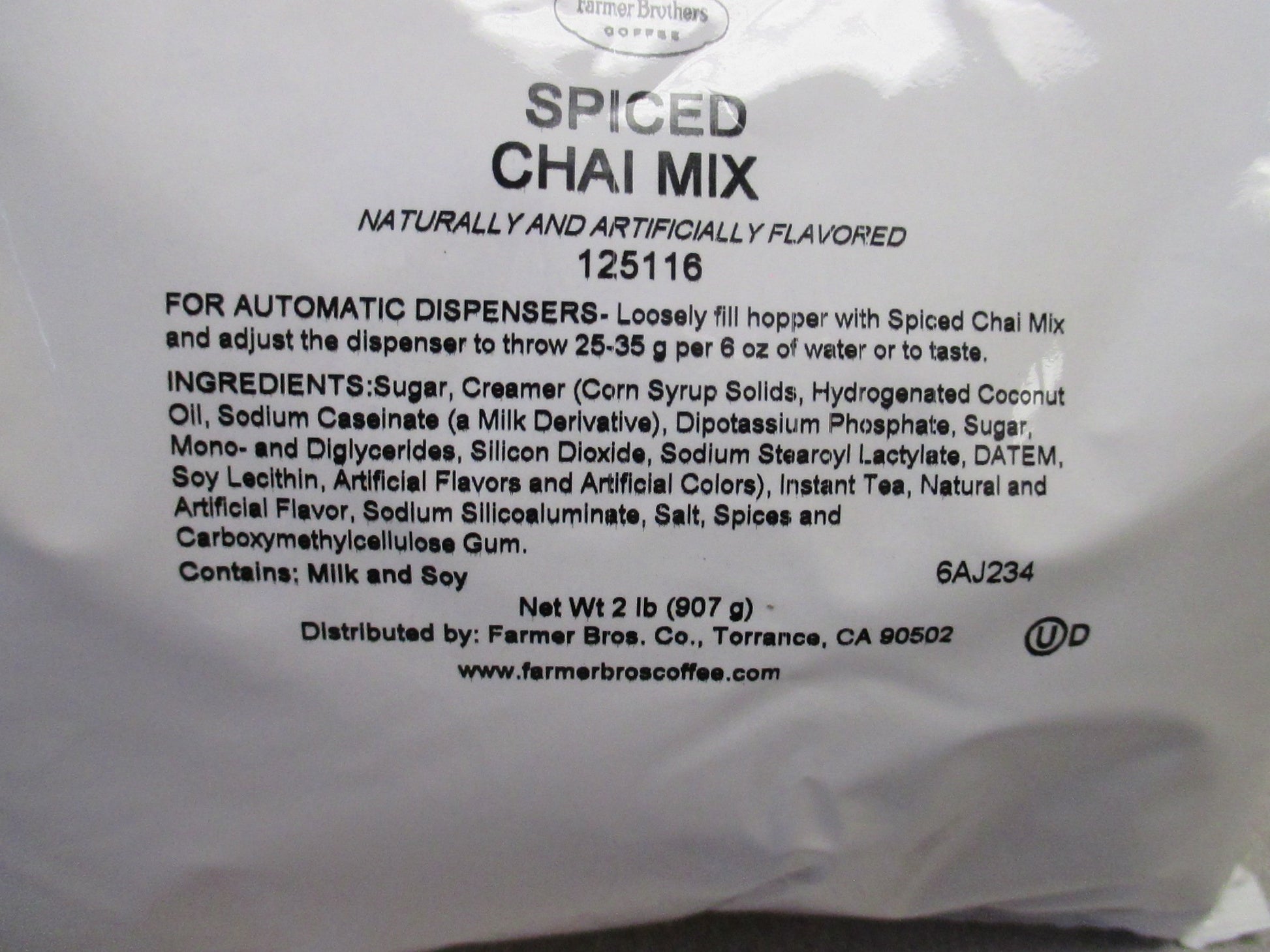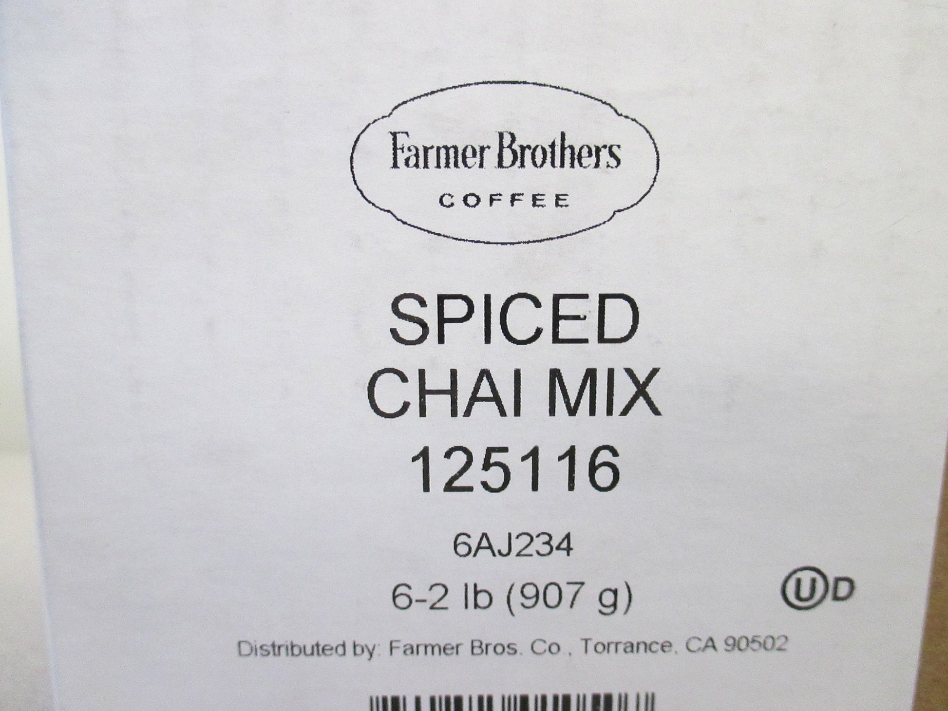 This Sale Is For 1 Case Of Spice Chai Farmer Bros Brand # 125115 This Is The Same Product That Is Sold Buy The Cup In Most Convienient Marts And C Store Chains. It Is Simply The Best Post Mix Product On The Market Superb Taste, Lots Of Froth, Marvelous Flavor, Wonderful Aroma Simply Mix With Hot Water For A Delicious Cappuccino Or Cold For A Cool Down Cappuccino Also May Be Used In A Blender Or Frozen Machine For A Rich Creamy Drink 6/2 Lb Bags Per Case Full Cases Only!! This May Not Ship Out In Original Box