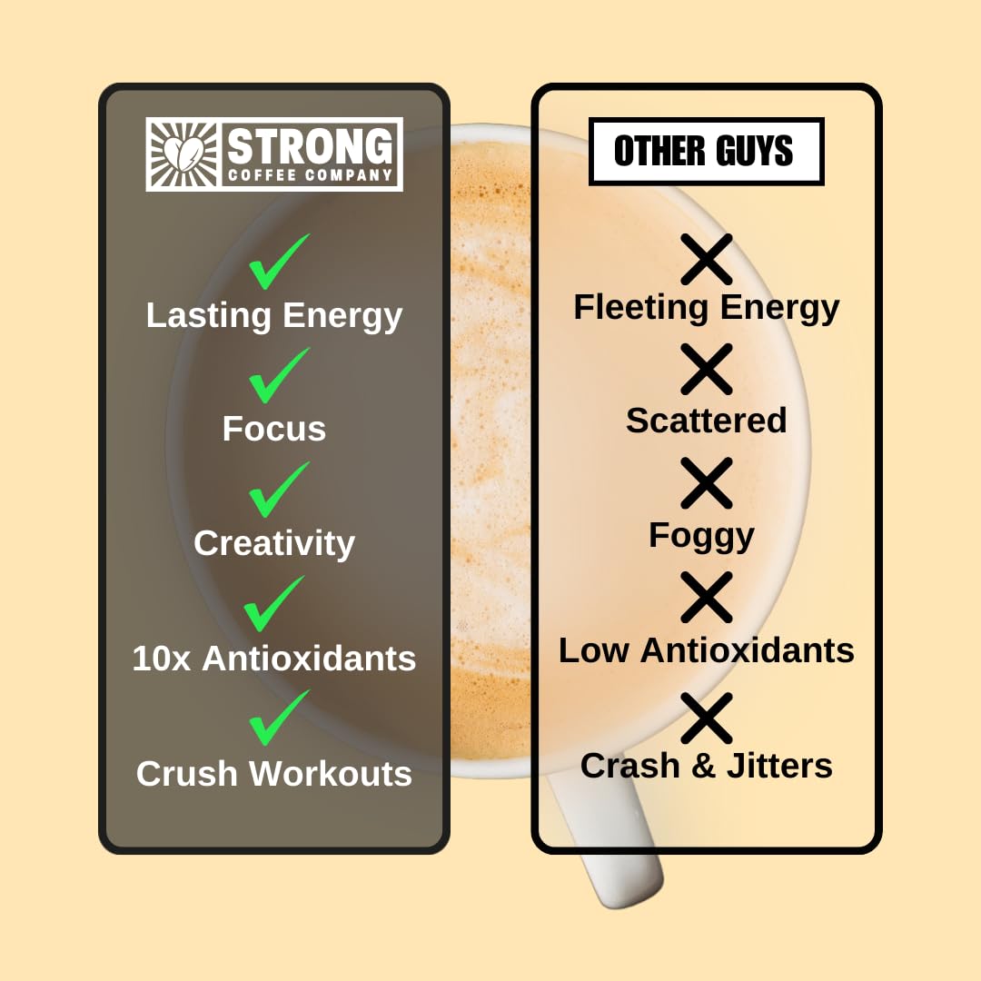 - Q: What sets STRONG COFFEE apart from regular instant coffee? A: STRONG COFFEE stands out from regular instant coffee due to its unique blend of high-quality fair trade arabica coffee, added protein, collagen, and adaptogens. It delivers a nutrient-rich beverage that not only satisfies your coffee cravings but also supports your overall health and wellness with every cup.