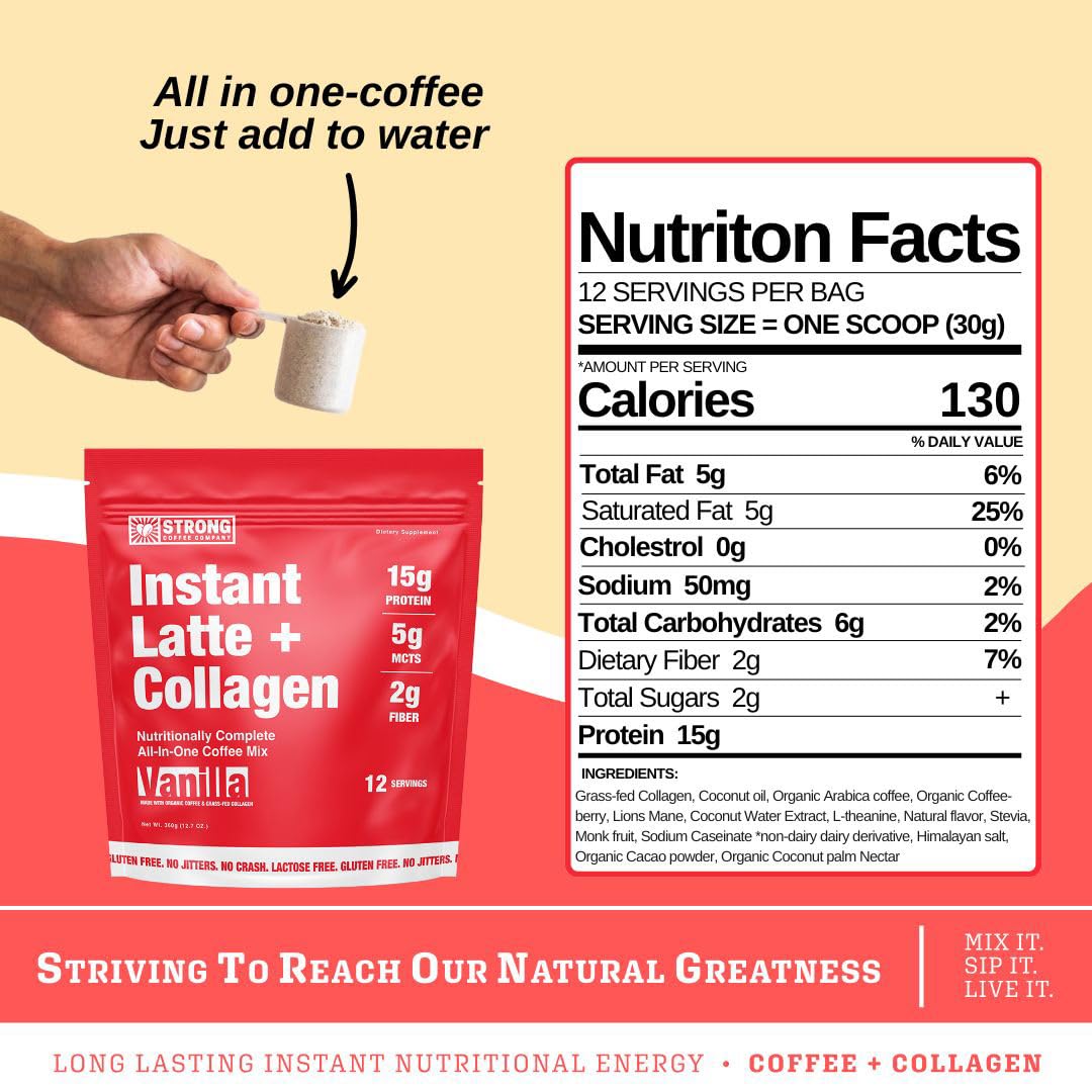 - Q: How do I prepare STRONG COFFEE's Instant Vanilla Latte? A: Preparing STRONG COFFEE's Instant Vanilla Latte is simple. Just add one scoop of the instant coffee to 8 to 10 ounces of hot or cold water, stir well, and enjoy. It's designed for convenience, allowing you to make a delicious latte without any brewing or extensive preparation.