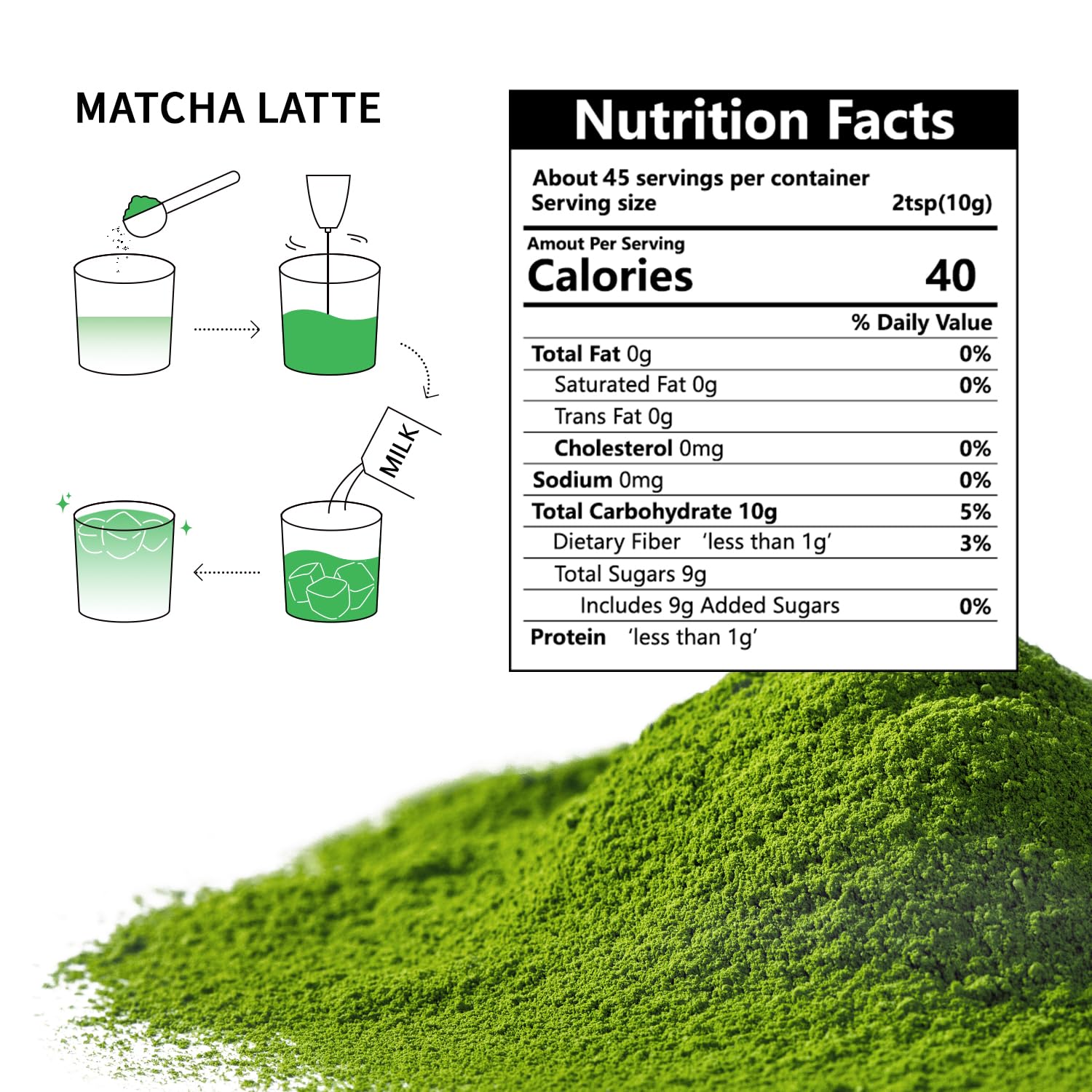 Q: How should I prepare a matcha latte using this powder?A: To prepare a matcha latte, mix 1-2 teaspoons of the matcha powder with hot water (not boiling) to make a smooth paste. Then add steamed milk or a milk alternative for a delicious latte experience.