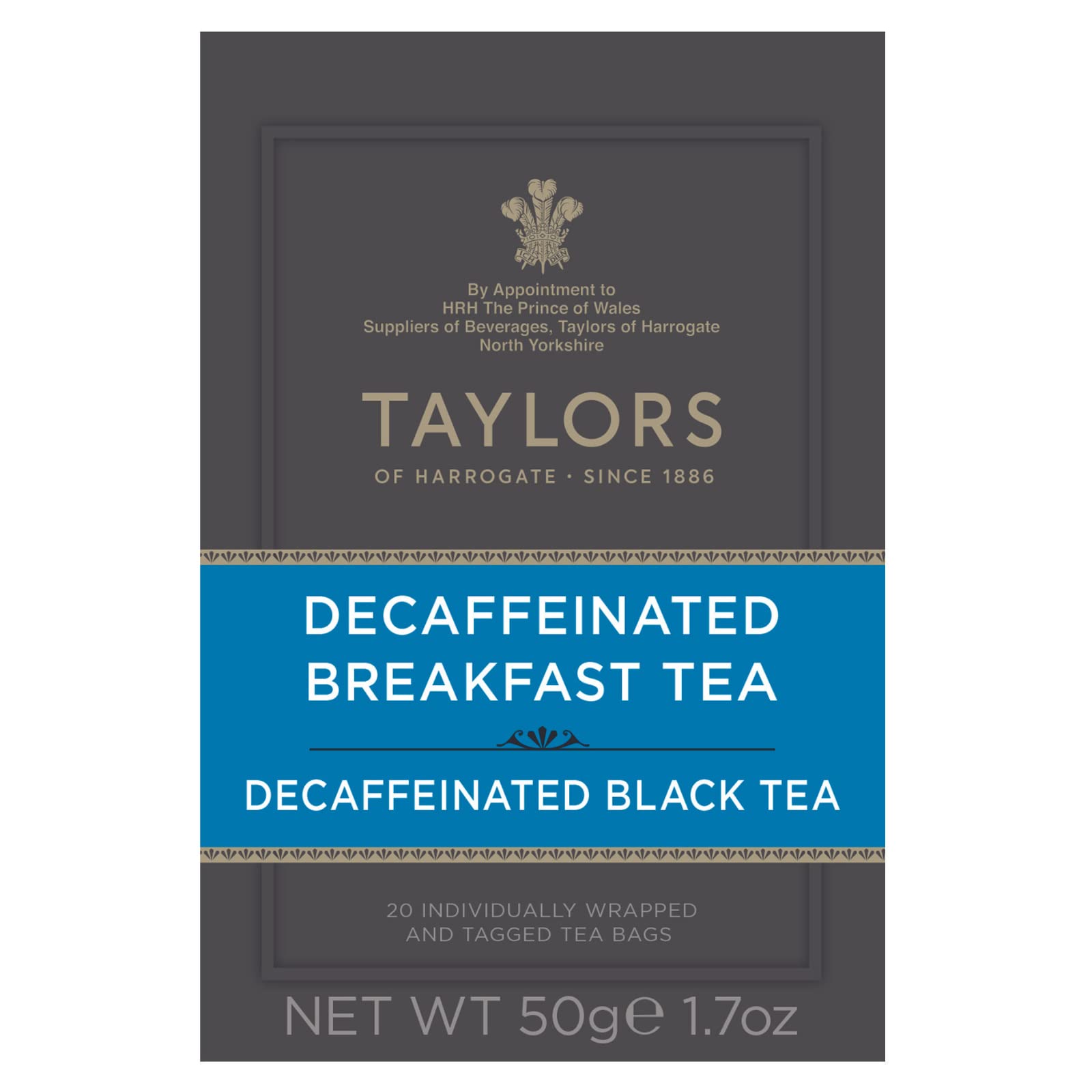 - Q: What makes Taylors of Harrogate Decaffeinated Breakfast tea different from regular black tea? A: Taylors of Harrogate Decaffeinated Breakfast tea is made from high-quality African teas that have been gently decaffeinated using the carbon dioxide method. This process ensures that the tea retains its bright and refreshing character while removing caffeine, making it perfect for any time of the day.