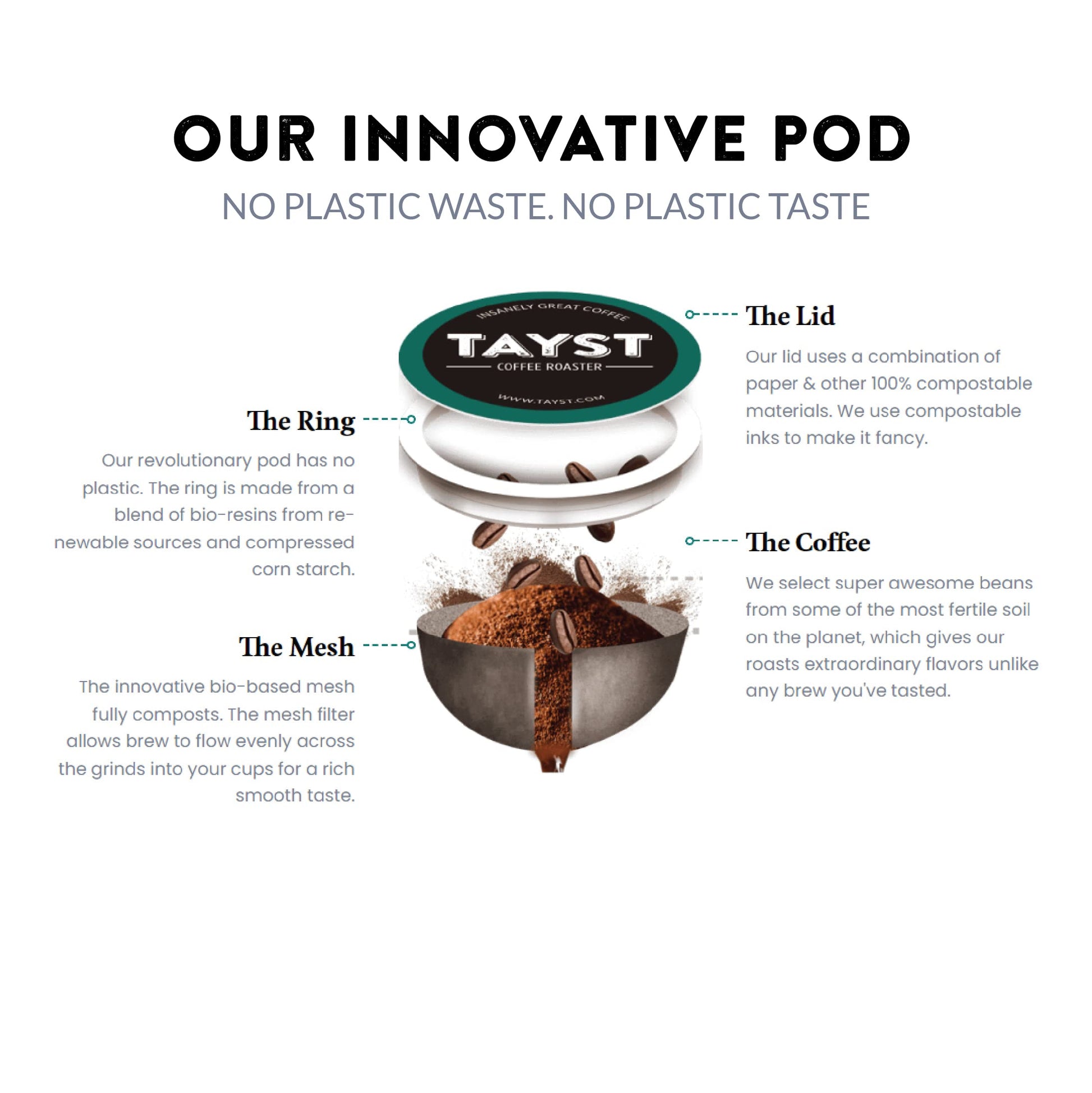 Bold & Brazen - This Bold Blend Offers A Rich Deep Flavor With A Smokey Cocoa Finish. Be Bold And Brazen Without Shame. Insanely Great Coffee - Awesome For The Planet - We'Re Taking Strides In Changing The World'S Perspective On Single Serve Coffees. Because It'S Convenient Doesn'T Mean It Has To Taste Crappy. We'Re Using Innovation To Make Single Serve Coffee Great. Superior Beans It All Starts With The Bean, The People Who Grow It And The Soil It Is Sewn. We Only Select The Finest Beans From Some Of The Most Fertile Soil On The Planet, Giving Our Beans The Roasted Coffee Flavors Only The Gods Have Dreamt. Our Perfectionist Roasters Coddle The Beans Every Step Of The Way Until The Grindmaster Crushes And Grinds Them To The Perfect Feel To Properly Extract The Flavors Into Your Cup. We Know, Sounds Like Poetry Right! Earth Friendly - Committed To Reducing The Impact Of Single Serve Coffee. We Searched For A Year To Find The Right Mechanism To Distribute Our Coffee Properly That Wouldnt Harm The Planet. 100% Compostable Made From The Earth, Tayst Compostable Coffee Pods Become One With The Earth, Creating Nutrient Rich Soil. The Lid Is Made From Bio Materials And Water-Based Compostable Ink. The Ring Is Made From Natural Bean Skins. The Mesh Is Renewable Bio Resins. Full Flavor Extraction Our Mesh Is Special! Rainforest Alliance Certifiedtm Void Of Harmful Pesticides While Supporting The Families And Communities That Grow Our Beans. Farmers Certified By The Rainforest Alliance Do Not Use Agrochemicals Prohibited By The United States Environmental Protection Agency. Participating Coffee Farmers Are Audited Annually Against A Rigorous Standard. We'Re Super Proud We'Re Able To Support Such An Organization. - So Please Go Ahead, Drink Up - Life'S Too Short, For Crappy Coffee!