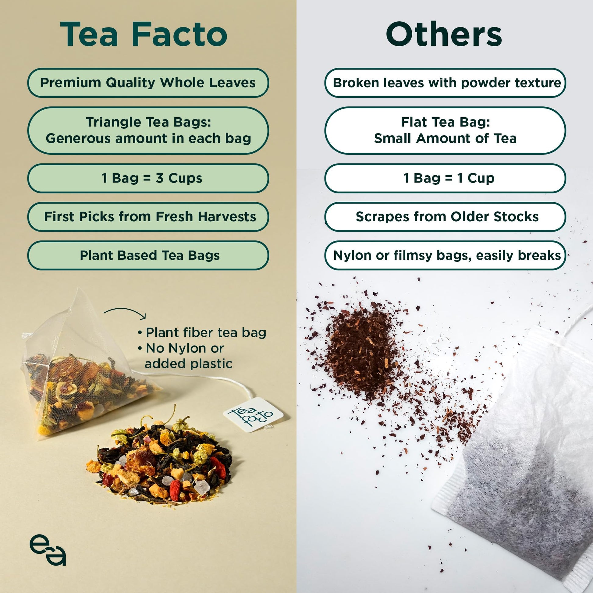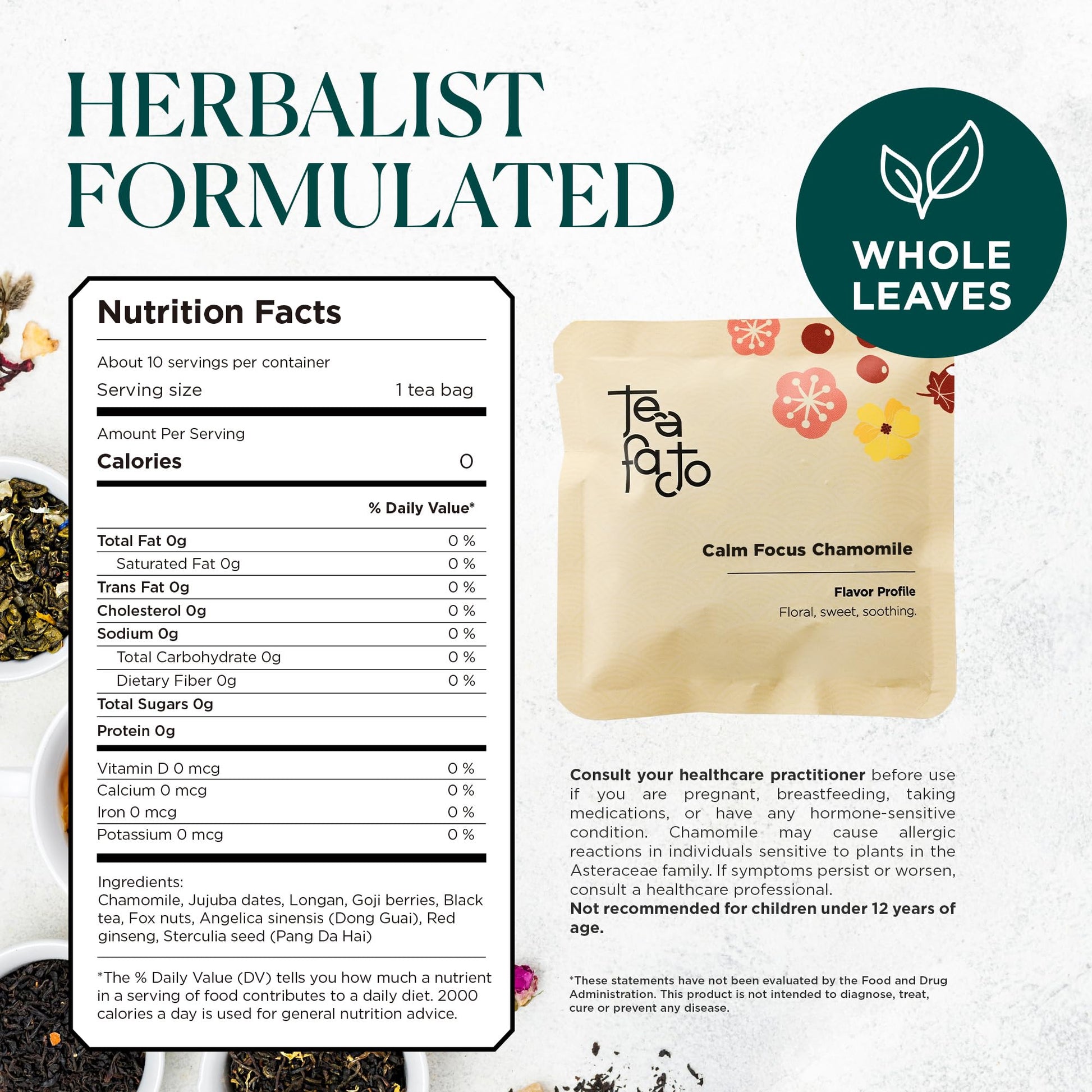 A Recipe Rooted in Tradition: this blend features chamomile tea loose leaf, chrysanthemum cassia seed tea leave, burdock root, mulberries, goji berries, honeysuckle - giving it a floral sweet taste. | Traditional Asian herbal powerhouses: documented since the 1600s, these ingredients are believed to balance the mind and body with a focus on the crown chakra.* | Effortless Brewing, Anytime: Enjoy the convenience of our camomile tea, made from corn fiber without plastic or nylon. Easy to brew, this versatile tea suits every time of day. | Whole leaf is wholesome: at Tea Facto, we believe in selecting the finest early-harvest whole tea leaves, which gives our tea blends their unique flavors. | Long Lasting Enjoyment: Perfect for sharing or savoring alone, this blend is available in 10 pack individually packed starter pack and 50-pack bulk pack.