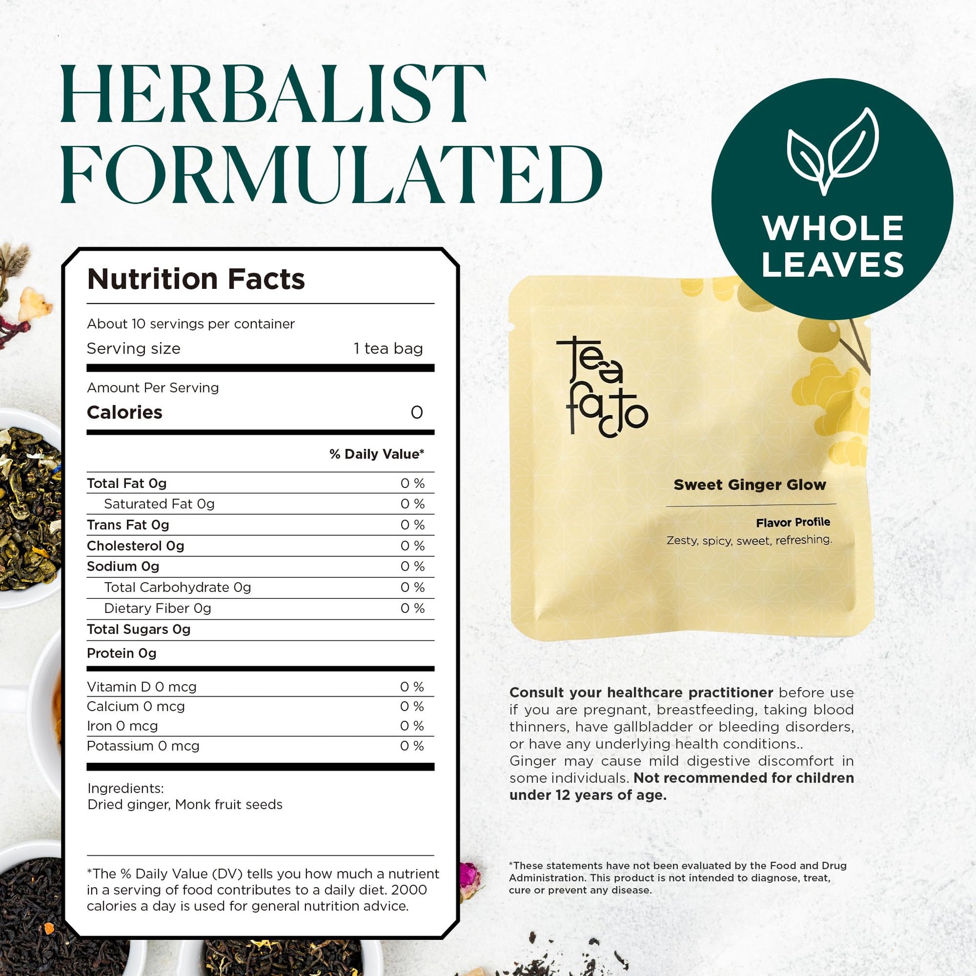 Comforting Ginger Tea: Specially crafted with ginger root tea and monk fruit seed, this blend tastes spicy and warming with a hint of naturally sweet. | A Recipe Rooted in Tradition: this simple and natural blend of whole ginger chunks and monk fruit seeds is documented since the 1600s in Chinese literature for their general benefits and Yang Balance.* | Effortless Brewing, Anytime: Enjoy the convenience of ginger tea bags, made from corn fiber without plastic or nylon. A flavorful sweet ginger brew ready in minutes. | Whole leaf is wholesome: at Tea Facto, we believe in selecting the finest early-harvest whole tea leaves, which gives our tea blends their unique flavors. | Long Lasting Enjoyment: Perfect for sharing or savoring alone, this blend is available in 10-bag individually sealed starter pack and 50-bag bulk pack.