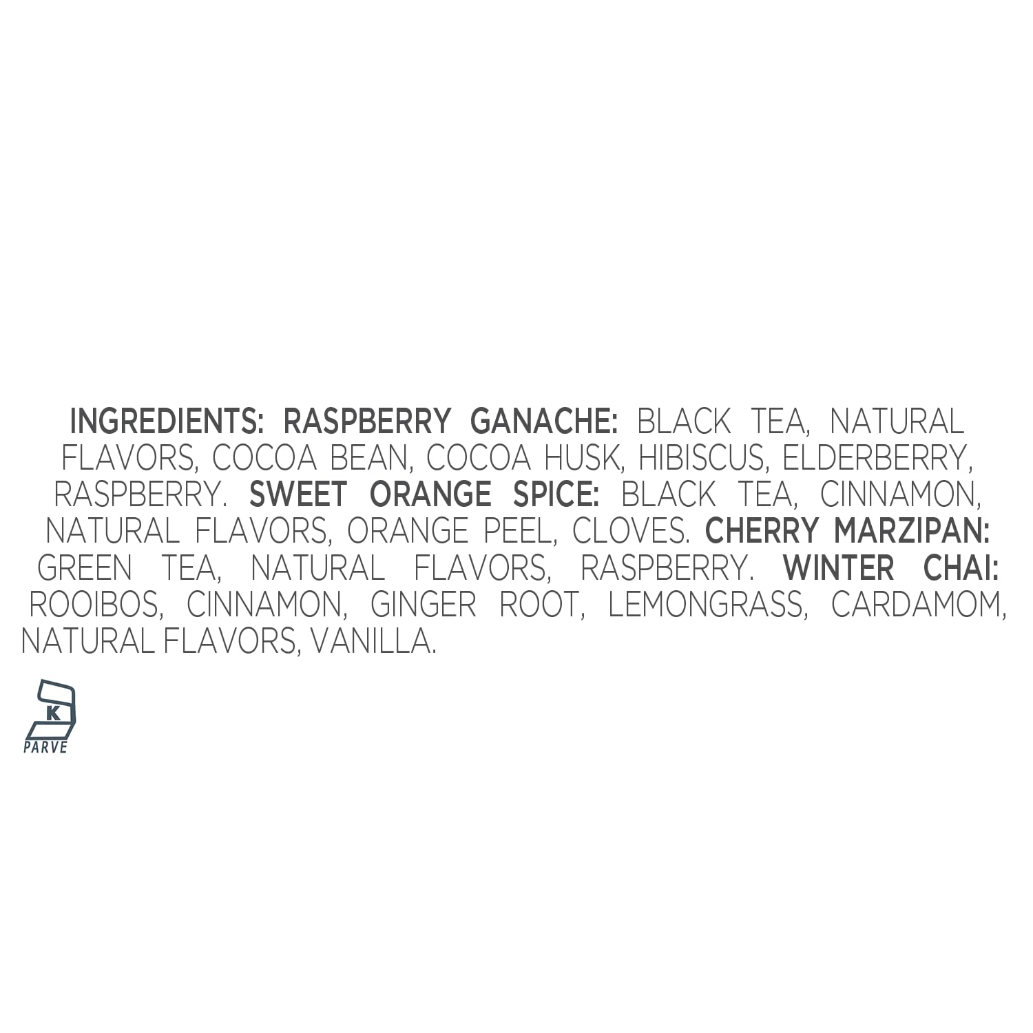 Q: What types of tea are included in the Tea Forte Warming Joy Holiday Petite Tea Tree sampler?A: The Tea Forte Warming Joy Holiday Petite Tea Tree includes four pyramid tea infusers featuring two black teas: Raspberry Ganache and Sweet Orange Spice, one green tea: Cherry Marzipan, and one herbal tea: Winter Chai.