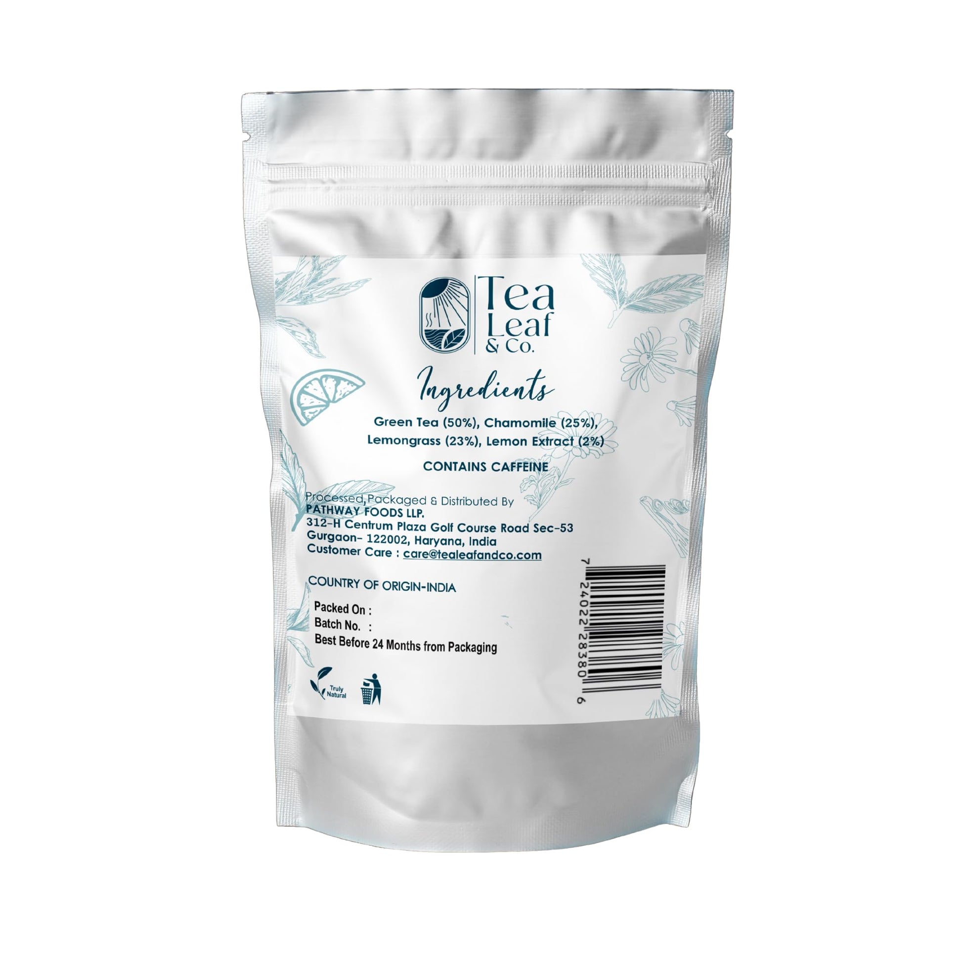 Q: What ingredients are in Tea Leaf & Co. Chamomile Green Tea Bags?A: Tea Leaf & Co. Chamomile Green Tea Bags are crafted with 100% natural ingredients, including green tea leaves, chamomile flower, lemongrass, and lemon extract, providing a refreshing and soothing beverage.