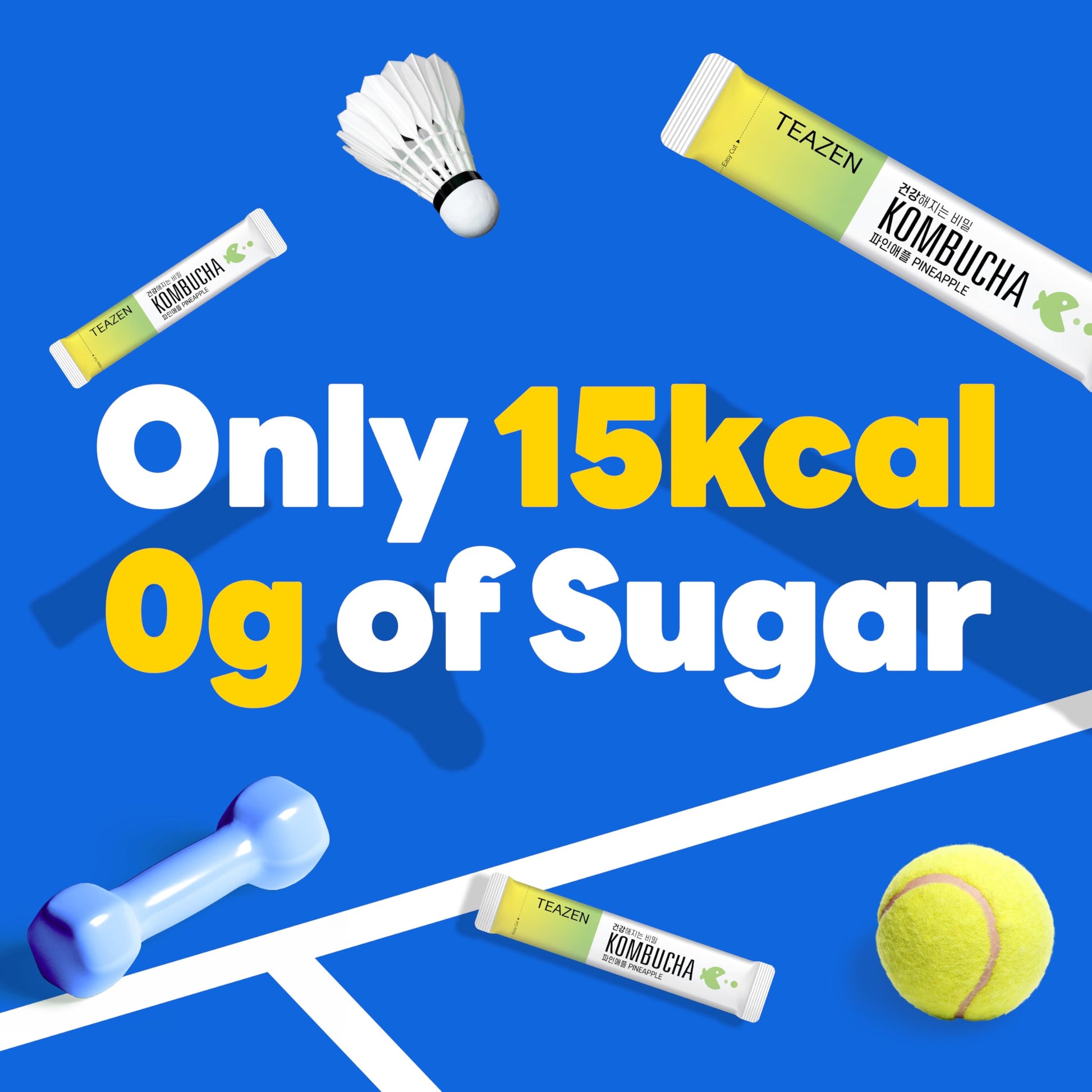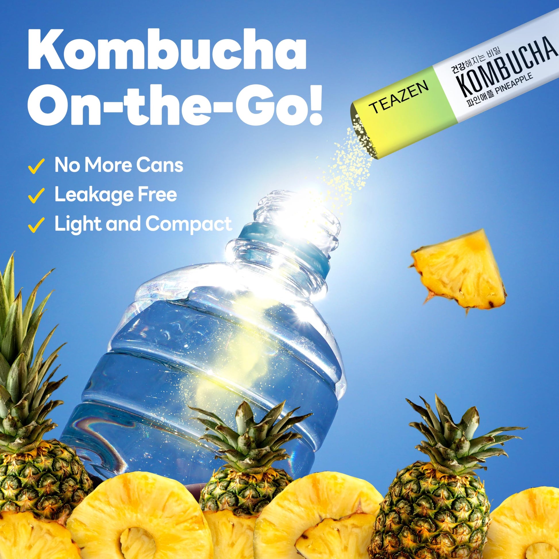 - Q: What are the health benefits of TEAZEN Pineapple Kombucha Tea? A: TEAZEN Pineapple Kombucha Tea is a sugar-free, alcohol-free beverage that contains both probiotics and prebiotics, promoting gut health and digestion. With only 15 calories per stick, it is a low-calorie alternative to sugary drinks, making it suitable for everyone.