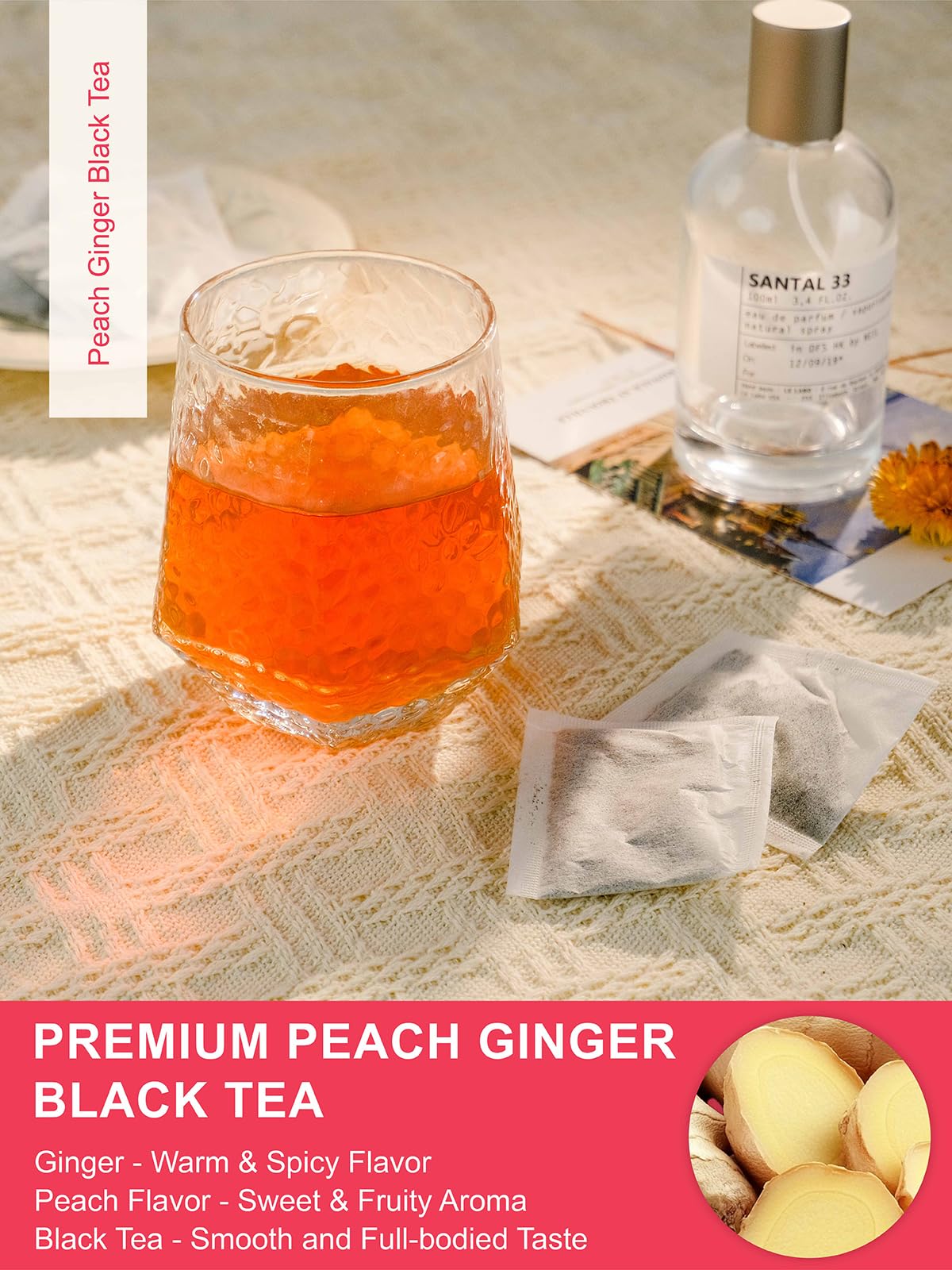Q: What are the main ingredients in TeeLux Peach Ginger Black Tea?A: TeeLux Peach Ginger Black Tea is made from a blend of premium black tea, spicy ginger, and natural peach flavor. This combination creates a smooth and zesty flavor profile that's both invigorating and refreshing.