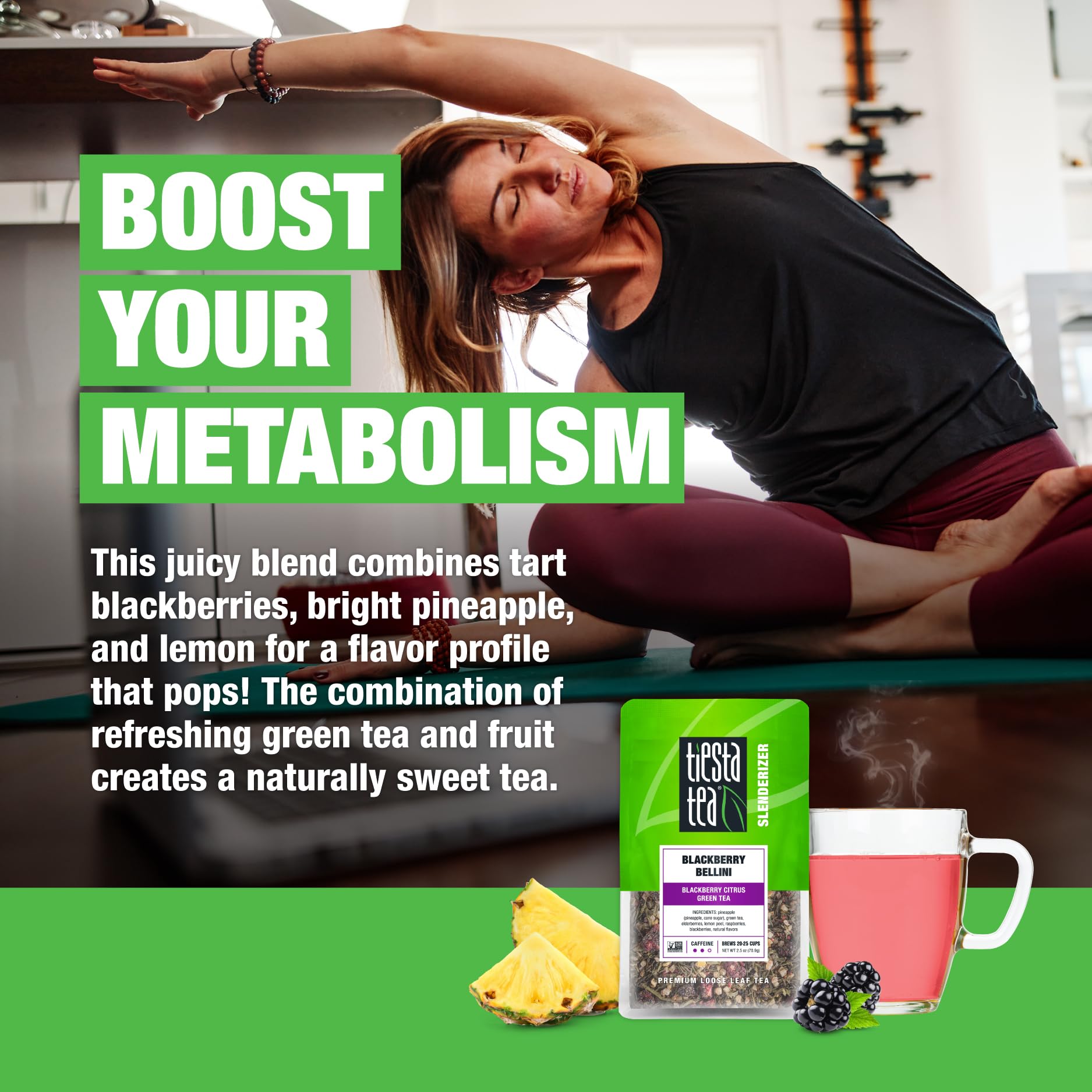 Q: What ingredients are in Tiesta Tea - Blackberry Bellini?A: Tiesta Tea - Blackberry Bellini features a blend of premium loose leaf green tea, blackberries, raspberries, pineapple, and lemon, creating a refreshing and flavorful tea experience.