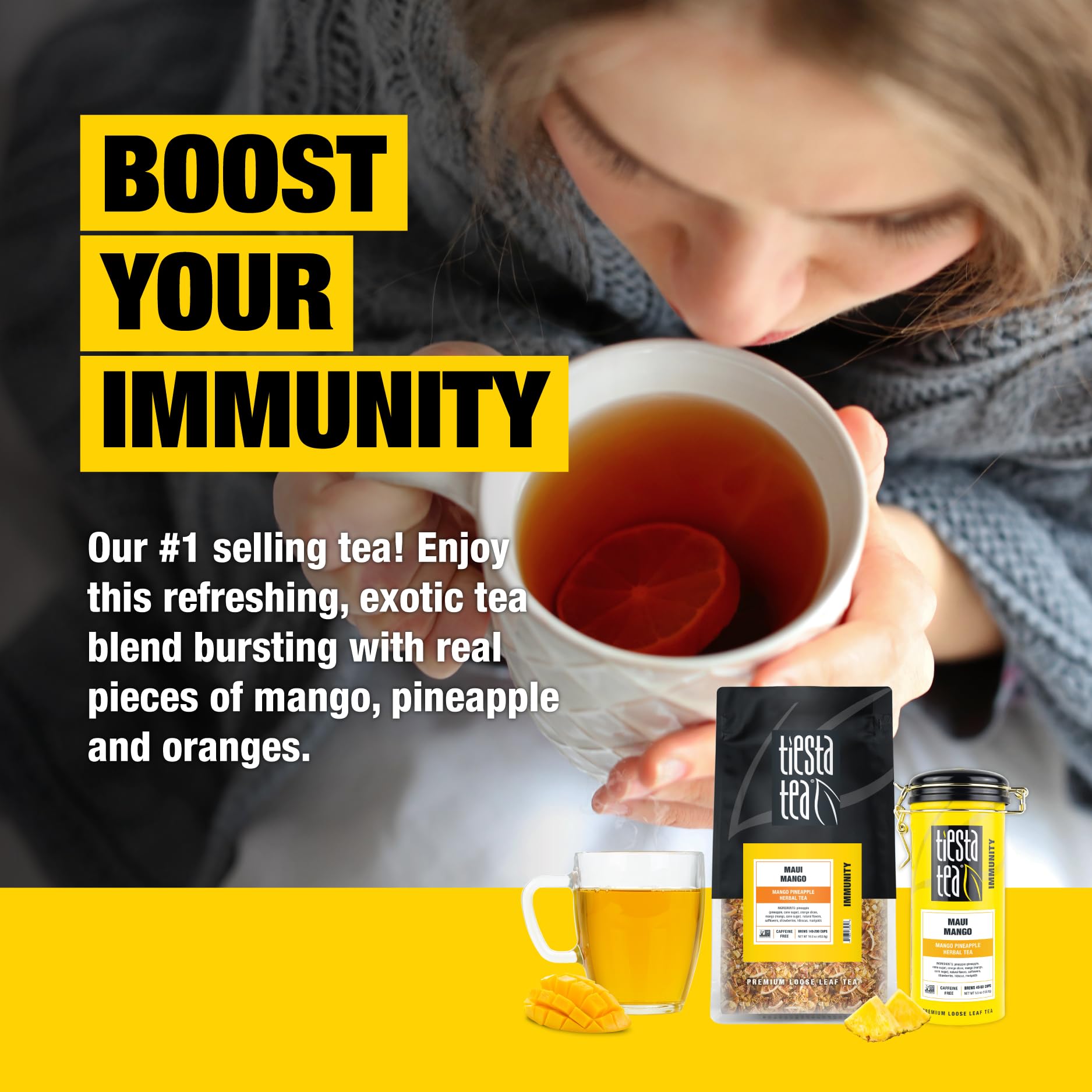 Q: What health benefits does Maui Mango tea provide?A: Maui Mango contains rooibos and herbal ingredients that may help boost immunity, providing vitamins and nutrients to support your well-being.