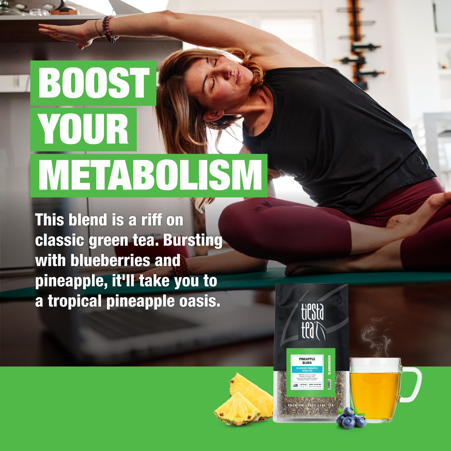 Q: What makes Tiesta Tea's Pineapple Blues blend unique?A: Tiesta Tea's Pineapple Blues is a unique blend of blueberry and pineapple flavors combined with premium green tea, offering a smooth, tropical taste that is ideal for both hot and iced beverages.