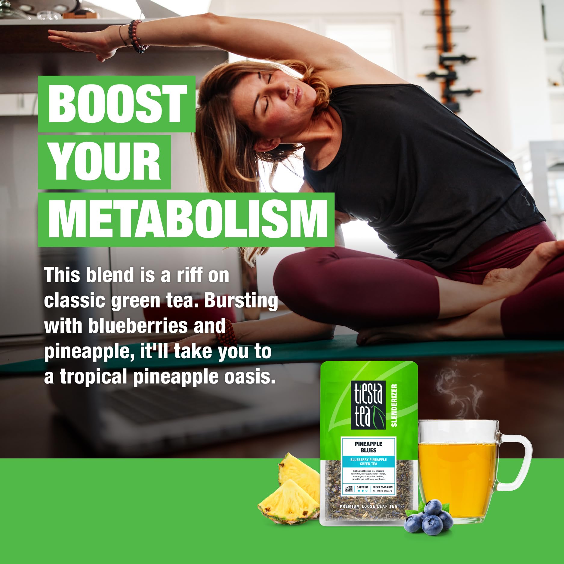 - Q: What makes Tiesta Tea's Pineapple Blues blend unique? A: Tiesta Tea's Pineapple Blues blend is unique due to its combination of blueberry and pineapple flavors, creating a tropical taste experience. The premium loose leaf green tea is crafted with natural ingredients, ensuring a refreshing and vibrant flavor profile that can be enjoyed hot or iced.