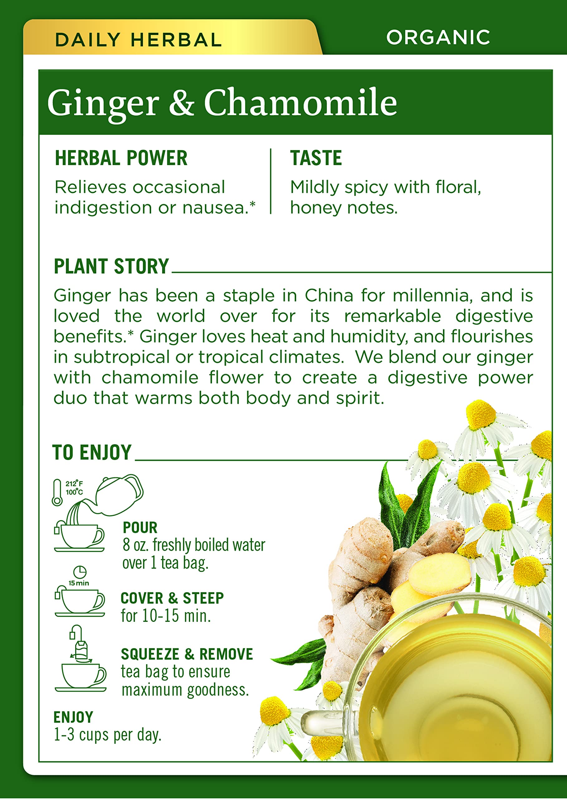 Q: What are the health benefits of Traditional Medicinals Organic Ginger & Chamomile Herbal Tea?A: This herbal tea is known for relieving occasional indigestion and nausea, thanks to the digestive properties of ginger combined with the calming effects of chamomile. It offers a soothing experience that can help enhance your overall digestive health.