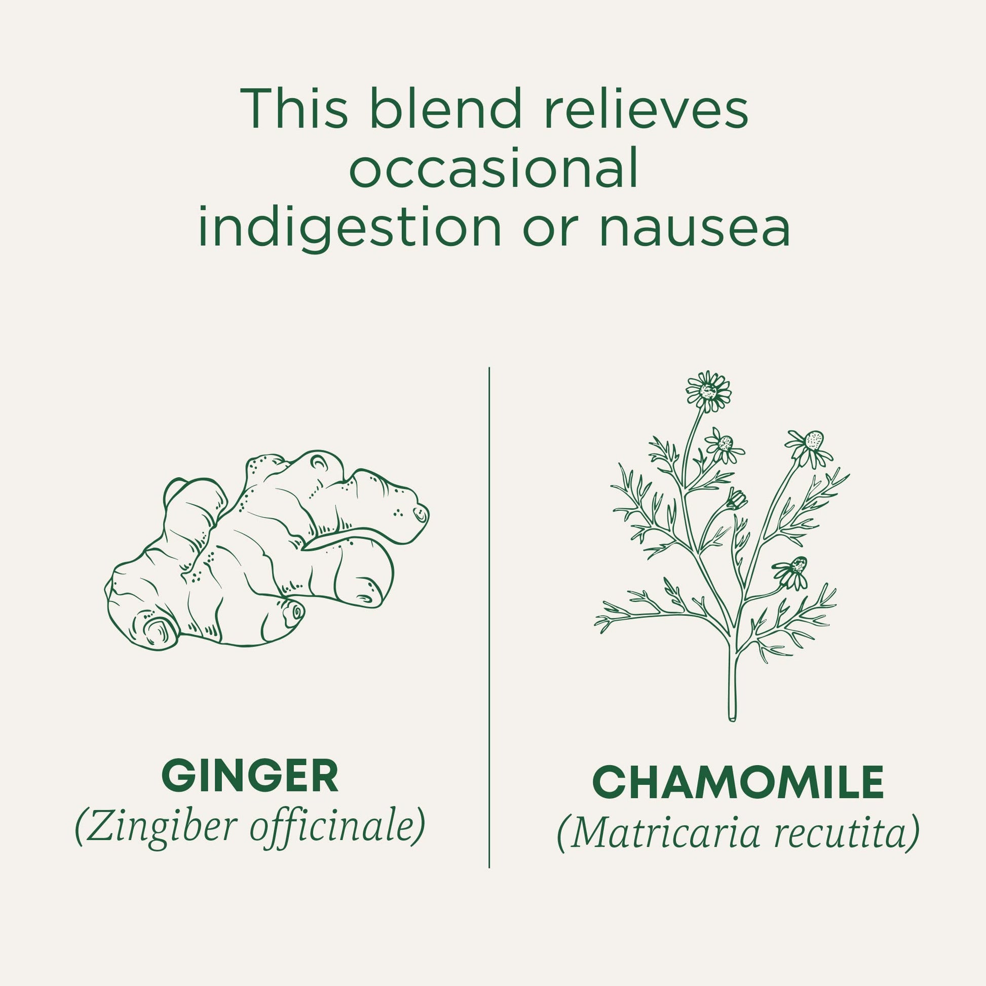 Q: What are the main benefits of Traditional Medicinals Organic Ginger & Chamomile Tea?A: This herbal tea is designed to relieve occasional indigestion and nausea, combining the digestive benefits of ginger with the soothing properties of chamomile.