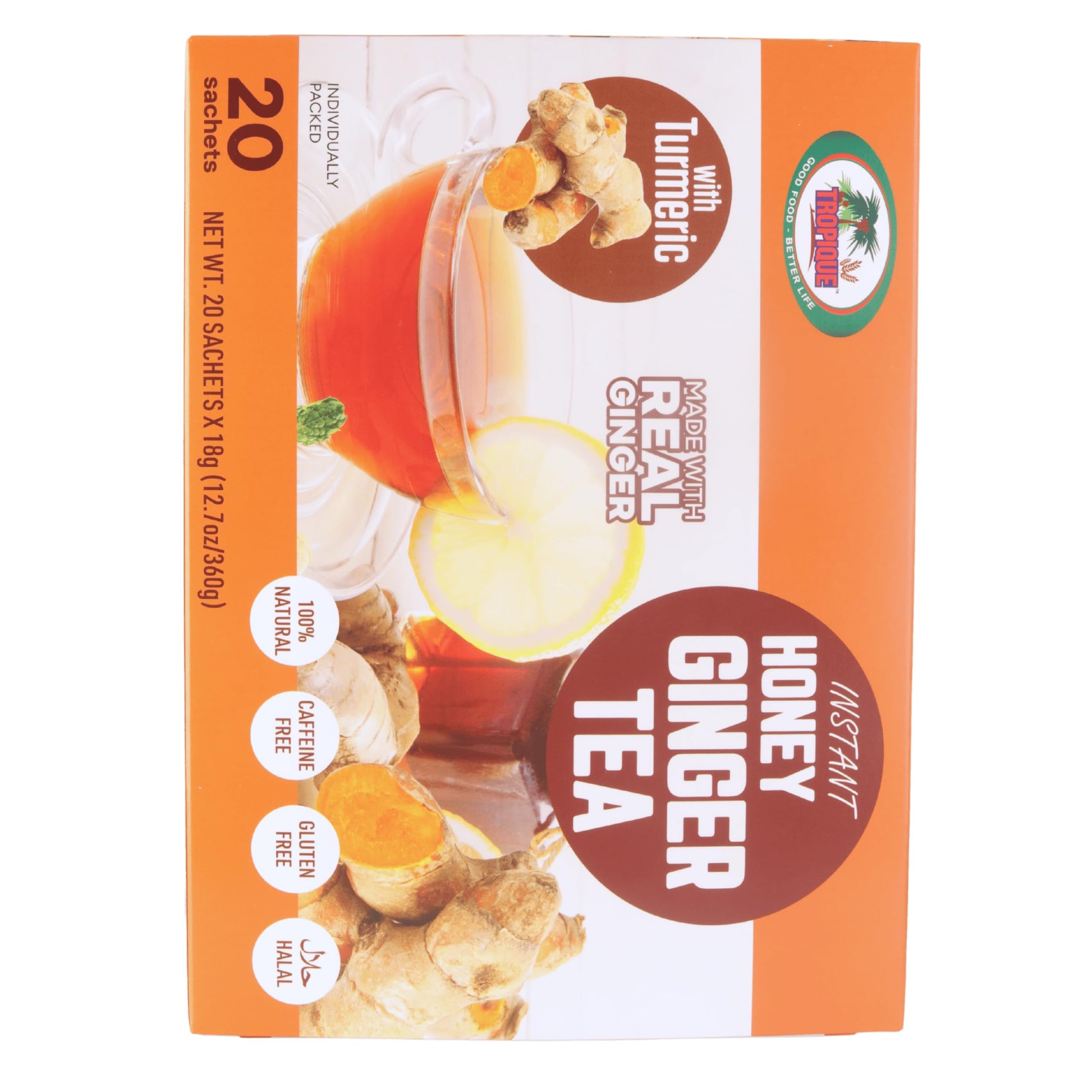 Q: What are the main ingredients in Tropique Instant Honey Ginger Tea?A: Tropique Instant Honey Ginger Tea is made with real ginger, honey, and turmeric, providing a natural and flavorful tea experience.