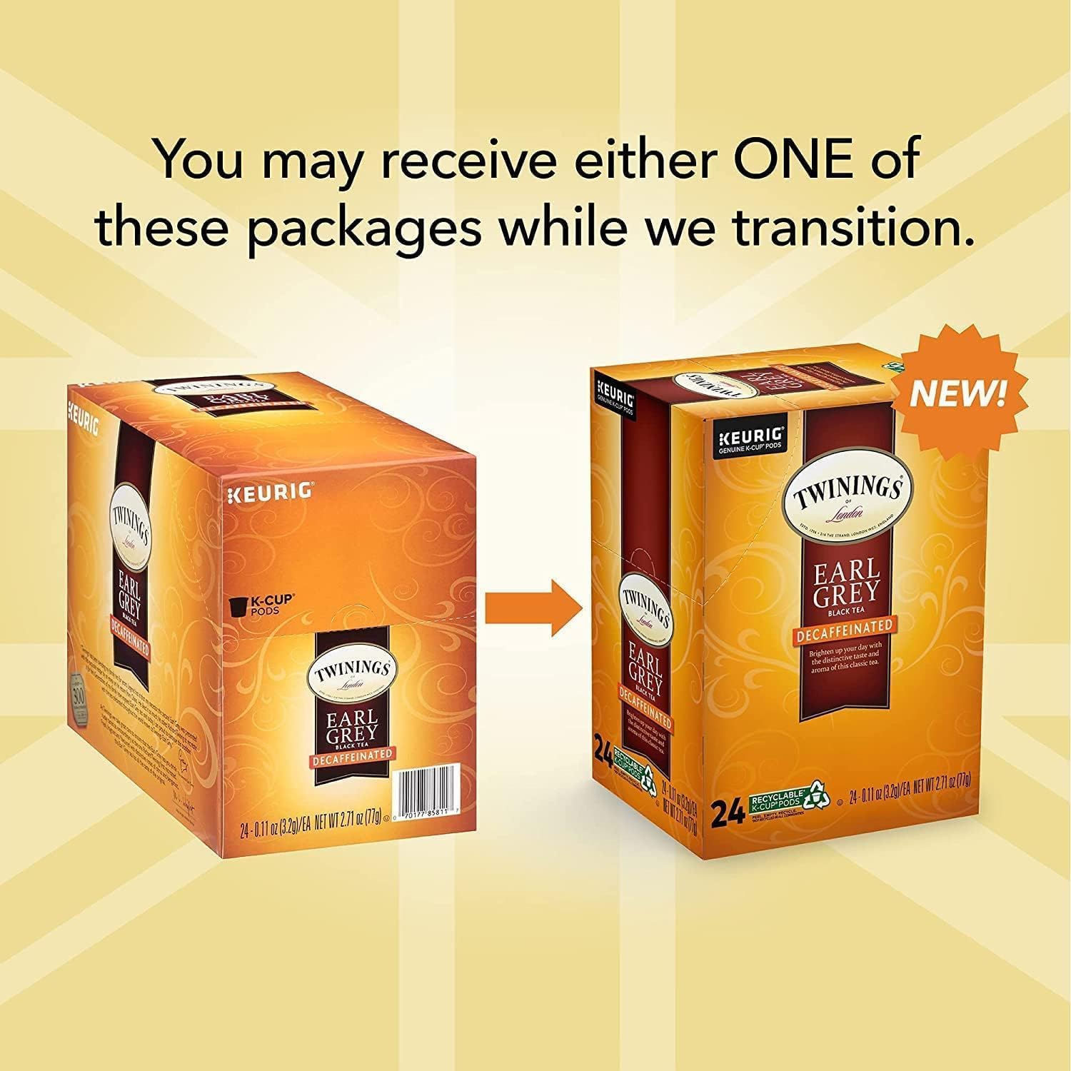 Q: What is the packaging size of the Twinings Decaf Earl Grey K-Cup Pods?A: Each box of Twinings Decaf Earl Grey K-Cup Pods contains 24 pods, providing you with plenty of servings to enjoy your favorite decaffeinated Earl Grey tea.