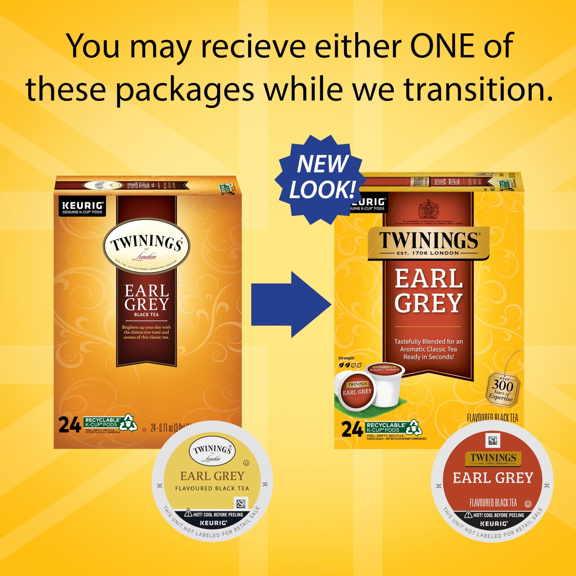 Q: How many K-Cup pods are included in the Twinings Earl Grey package?A: The Twinings Earl Grey Black Tea K-Cup Pods package includes two boxes, each containing 24 K-Cup pods, for a total of 48 servings.