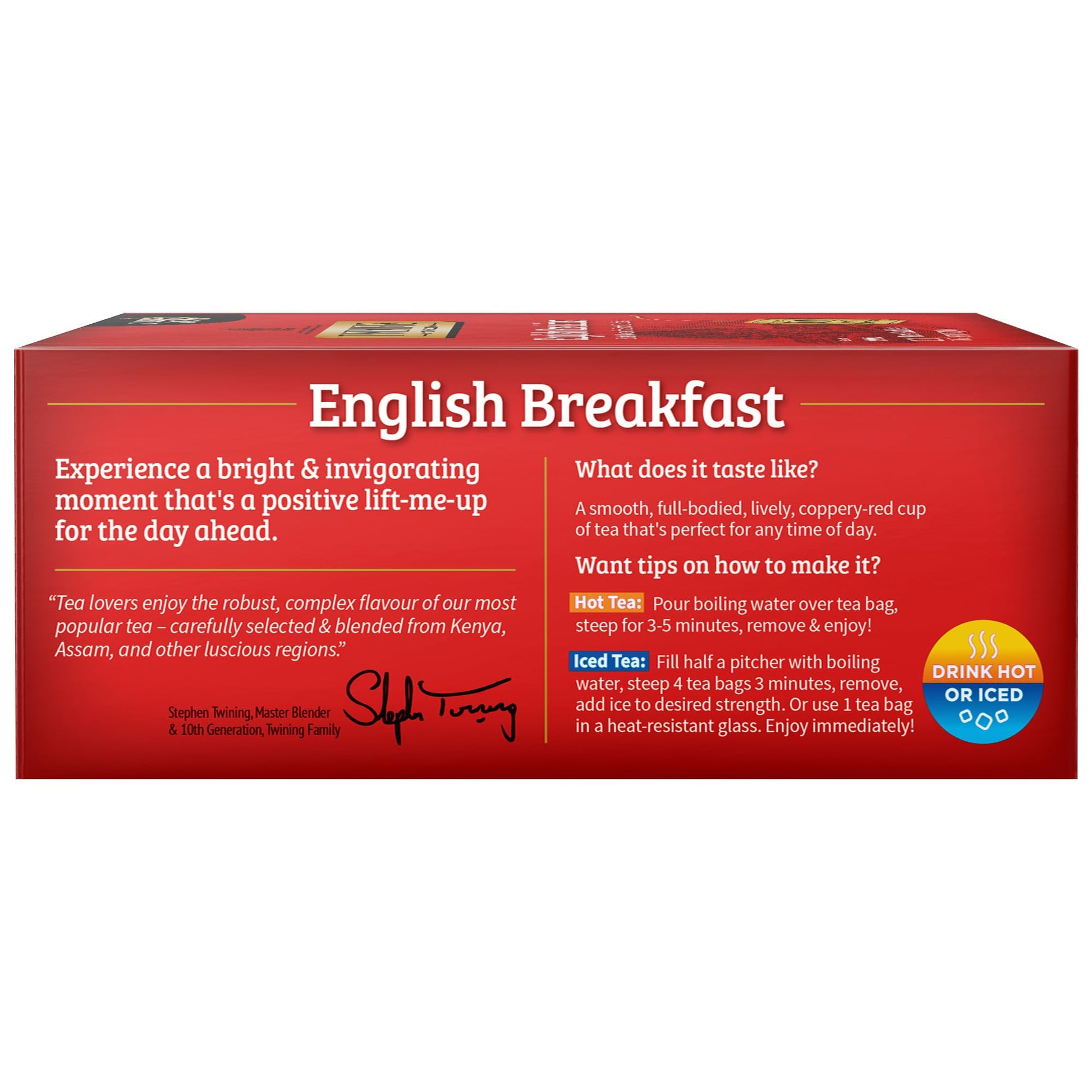 • Q: Can I use Twinings English Breakfast Black Tea for making iced tea? A: Absolutely! Twinings English Breakfast Black Tea is excellent for iced tea. Simply steep the tea bags in boiling water as instructed, remove them after 3 minutes, and then add ice and cool water to achieve your desired strength.