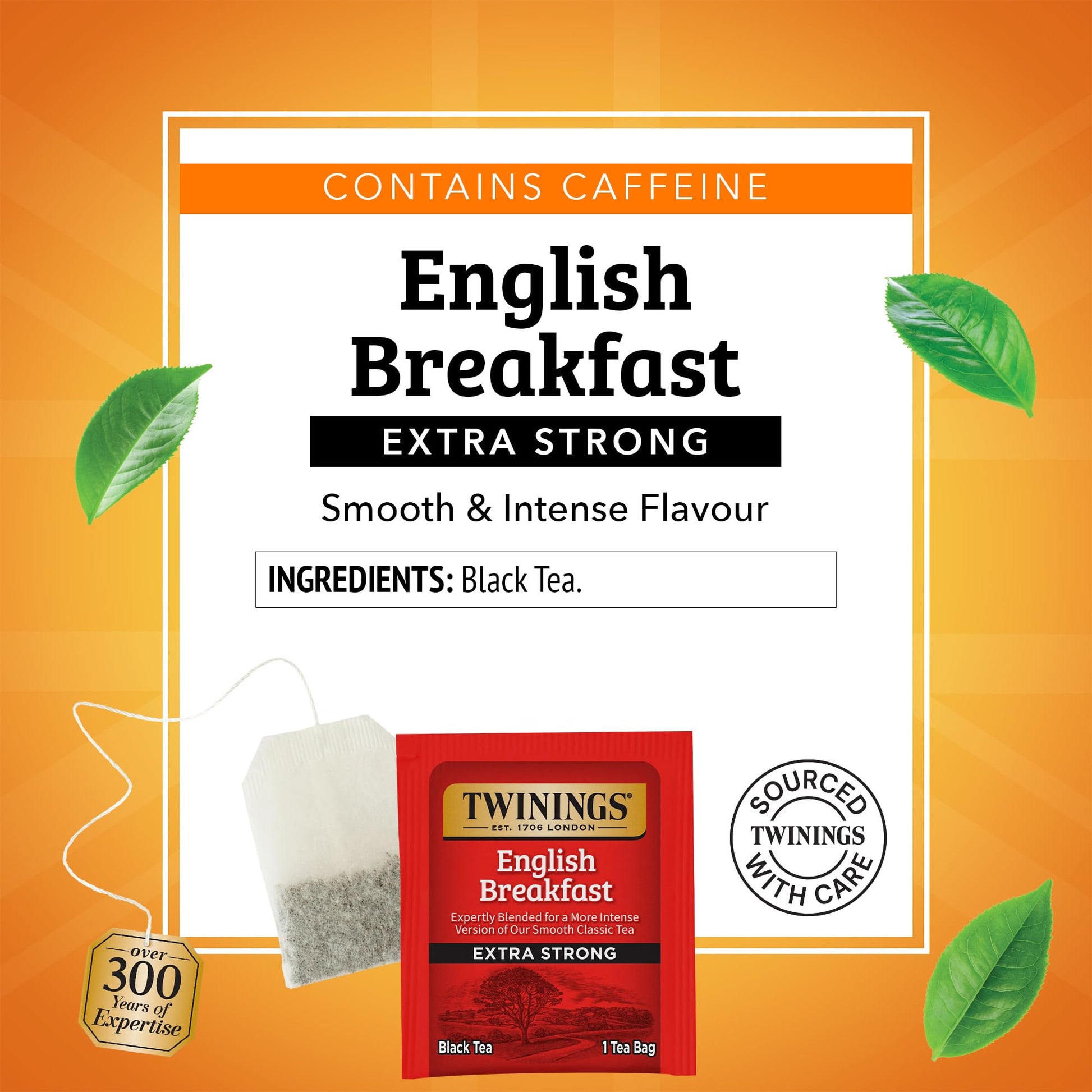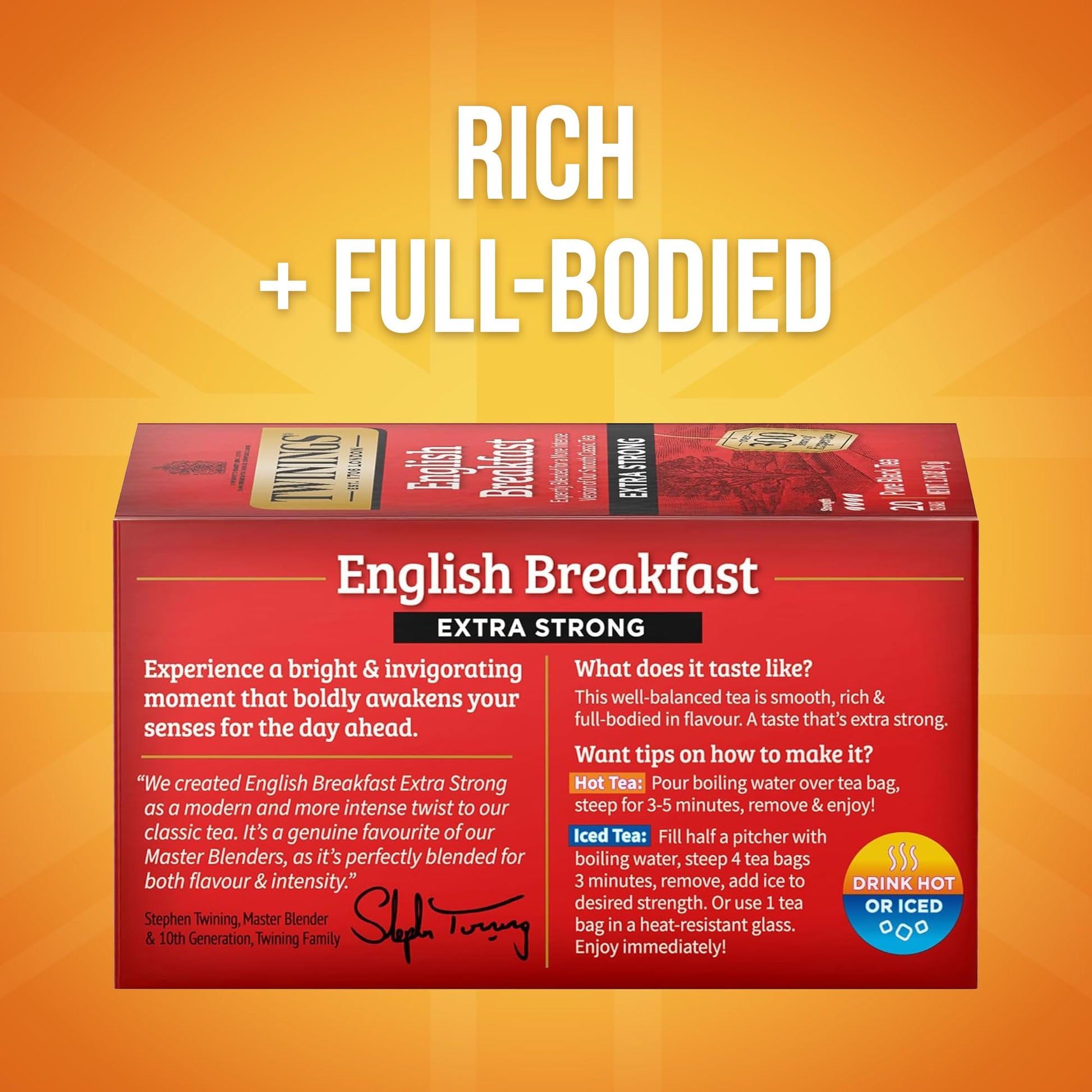 - Q: How many teabags come in a pack of Twinings Extra Bold English Breakfast tea? A: Each pack of Twinings Extra Bold English Breakfast Black Tea contains 20 individually wrapped teabags, ensuring freshness and convenience for your tea brewing experience.