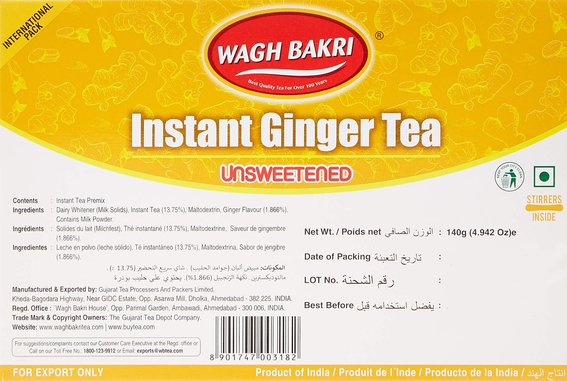 - Q: What makes Wagh Bakri Instant Ginger Tea a healthy choice? A: Wagh Bakri Instant Ginger Tea is unsweetened and contains no added sugar, making it a great option for those looking to enjoy a flavorful cup of chai without the extra calories. The ginger flavor not only adds taste but also offers potential health benefits, such as aiding digestion and boosting immunity.
