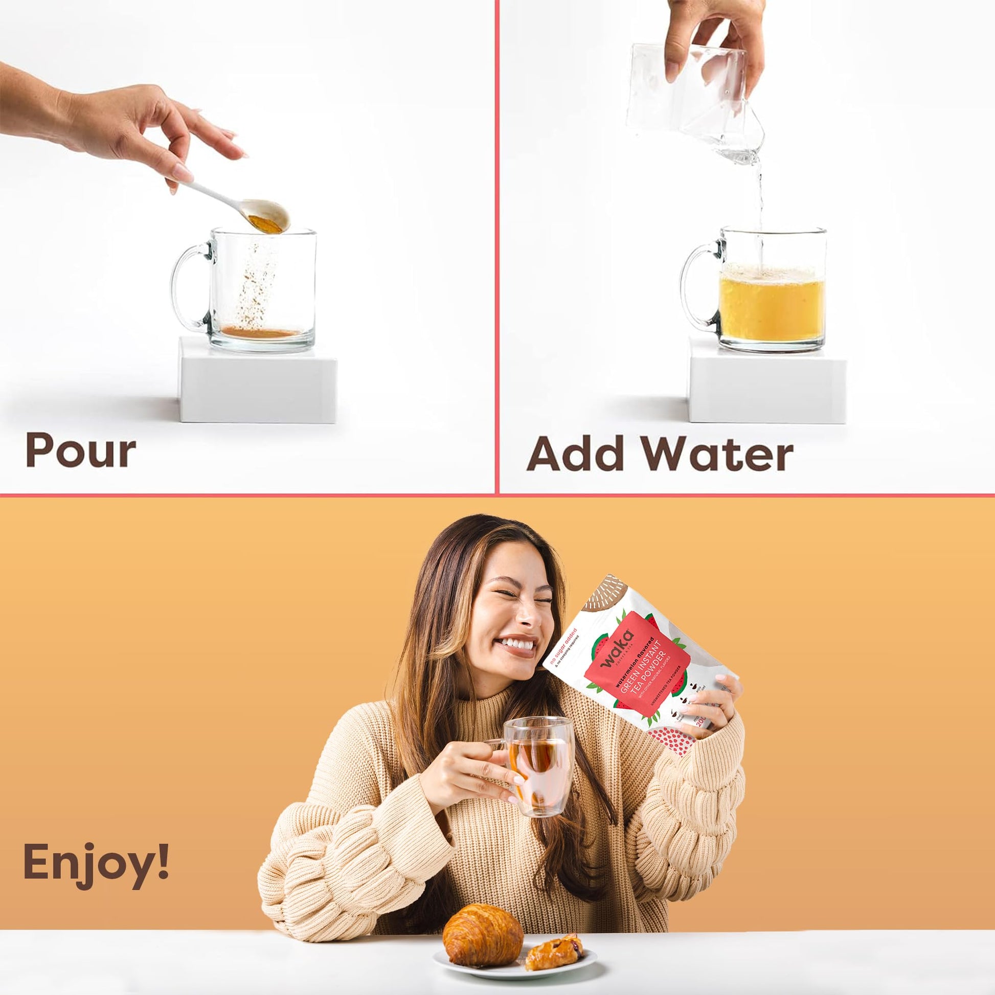 Q: How do I prepare Waka Instant Tea?A: To prepare Waka Instant Tea, simply mix one serving of the green tea powder with hot or cold water, stir well, and enjoy a refreshing beverage instantly.