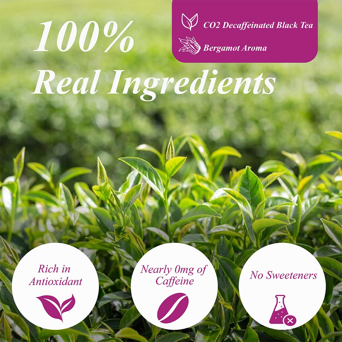 Co2-Decaffeinated Black TeaDecaf Black Tea Bags Have Chosen To Use The Co2 Method Of Decaffeination, So The Flavor And Antioxidants Are Preserved To The Maximum And It Is Safe To Drink | Citrus Notes & Balanced FlavorBergamot Brings Fresh Lemon And Sweet Citrus Notes To This Well-Balanced Decaf Earl Grey Tea With The Smooth Taste Of Black Tea And A Hint Of Bergamot | No Caffeine JittersDrinking Decaf Earl Grey Tea Is Often Part Of A Comforting Ritual, Such As Afternoon Tea Or A Quiet Moment In The Morning Or Evening. It Delivers The Same Rich And Fragrant Flavor Without The Stimulating Effects Of Caffeine | VersatilityEarl Grey Can Be Served Hot Or Iced, With Or Without Milk, And Can Even Be Turned Into A Variety Of Drinks, Such As Earl Grey Lattes, Which Combine It With Steamed Milk And Vanilla Syrup | Eco-Conscious & ConvenienceNote: Slight Discoloration Of The Tea Bag Paper Is Due To The Presence Of Bergamot Oil And Is Perfectly Natural. Unbleached And Compostable Tea Bags Come Packed In A Re-Sealable Kraft Bag | Order With ConfidenceIf You Have Any Questions, Just Send Us An Email And We Will Take Care Of It For You