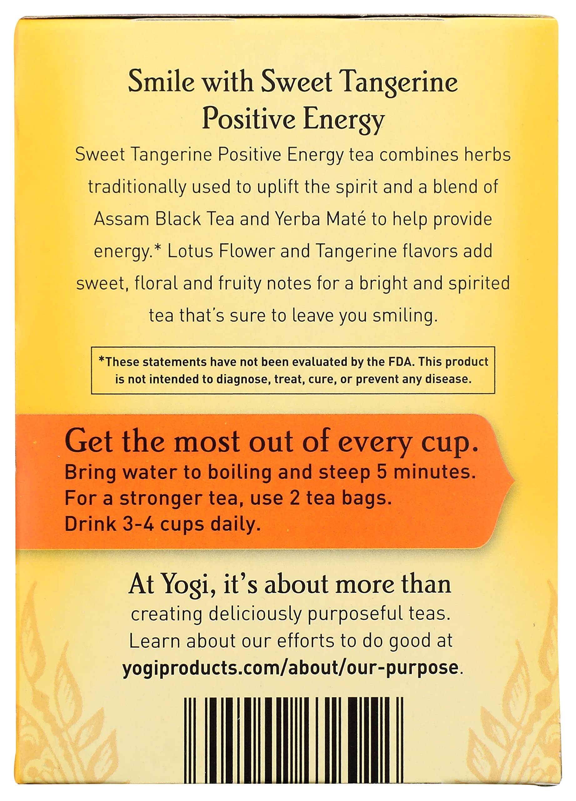 Yogi Sweet Tangerine Positive Energy Tea Combines Ashwagandha, An Herb Traditionally Used To Uplift The Spirit; With An Invigorating Blend Of Assam Black Tea And Yerba Mat Leaf To Help Provide Energy.* Notes Of Lotus Flower And Tangerine Add Sweet, Floral, And Fruity Flavor. Uplift Your Spirit With An Energizing Cup Of Yogi Sweet Tangerine Positive Energy Tea, A Bright And Flavorful Blend Thats Sure To Leave You Smiling.
