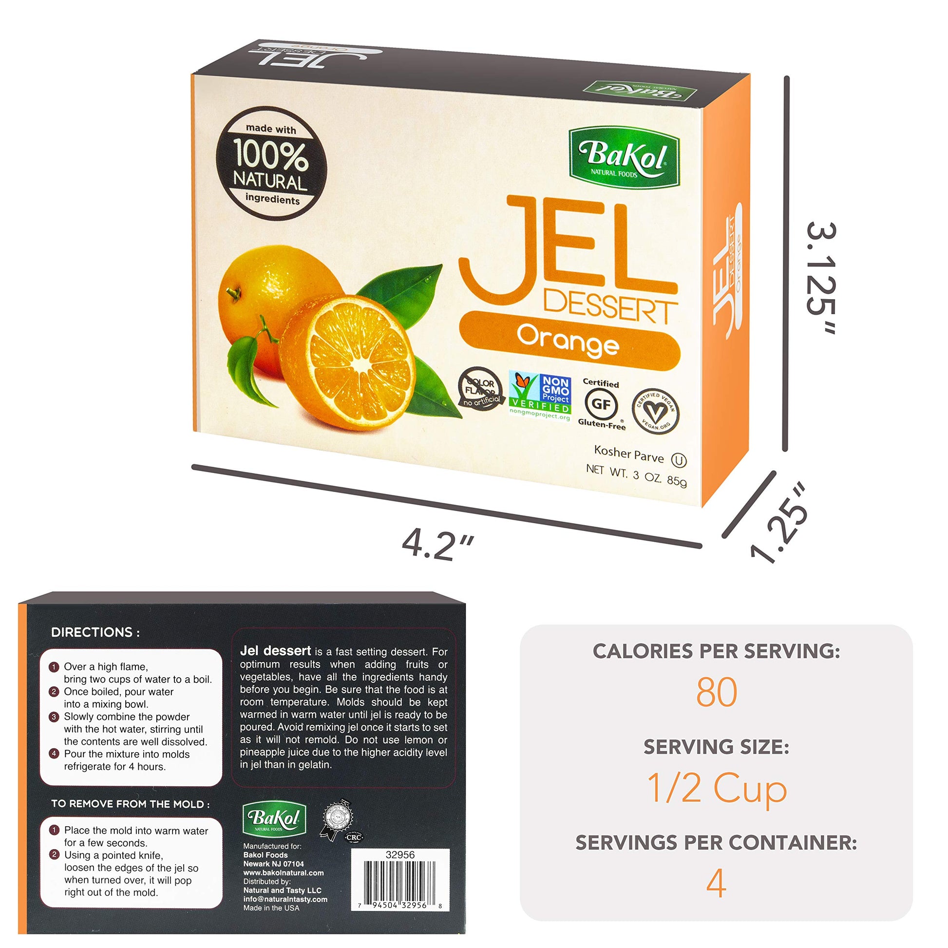 You Can Have Your Jel Desert And Be Vegan Too. Trying To Eat Healthy Foods, Should Not Mean Missing Out On Favorites. Thats Why We Offer You A Keto Friendly Jel Dessert Thats 100% Natural And Vegan. Sweet And Flavorful With The Perfect Jelly Texture, Bakol Jel Desserts, Will Be Your New Best Option. Available In Different Flavors So Everyone Will Find The All Natural Dessert They Love. Vegan Dessert Mixes Available: Lemon Orange Raspberry Strawberry Cherry Unflavored Why Choose Bakol Jel Desserts: Natural Ingredients Only - No Artificial Colors, Flavors Or Sweeteners. 100% Vegan - There Is No Animal Gelatin. Great Taste- You Dont Have To Compromise On Flavor Or Texture. Its The Right Gelatin Dessert If You Eat Kosher, Vegan, Or Halal; Or If Youre On A Keto Diet. How To Prepare: Boil 2 Cups Of Water Pour Water Into A Mixing Bowl Combine The Powder With Hot Water, Stirring Until Dissolved. Pour The Mixture Into Molds And Chill Until Set. What To Use The Natural Jel For: Kids Cooking Craft Jello Shots Refreshing Dessert Specifications: Orange Flavor Cup Per Serving 80 Calories Per Serving 19G Sugar Per Serving Servings Per Container: 4 Ingredients: Evaporated Cane Juice, Vegetable Gum, Citric Acid, Potassium Citrate, Natural Flavor, Beet Powder Enjoy The Perfect Natural Gelatin Jel Dessert Without Any Compromise. Buy Now.